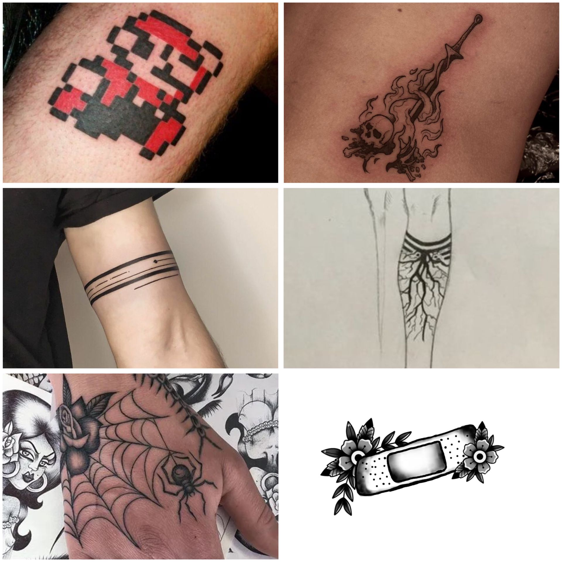 so the mario one is pixelated like the first few games that came out and a lot smaller than what's pictured up there, but it's just to give you a visual. the skull/sword one is on his ribcage. the upside down (see what i did there?) tree one below it is on his leg, and the bandaid one is on the side of his neck. that one is in solidarity from where billy tried to strangle him, but i'll mention that more later. our boy is TATTED!!