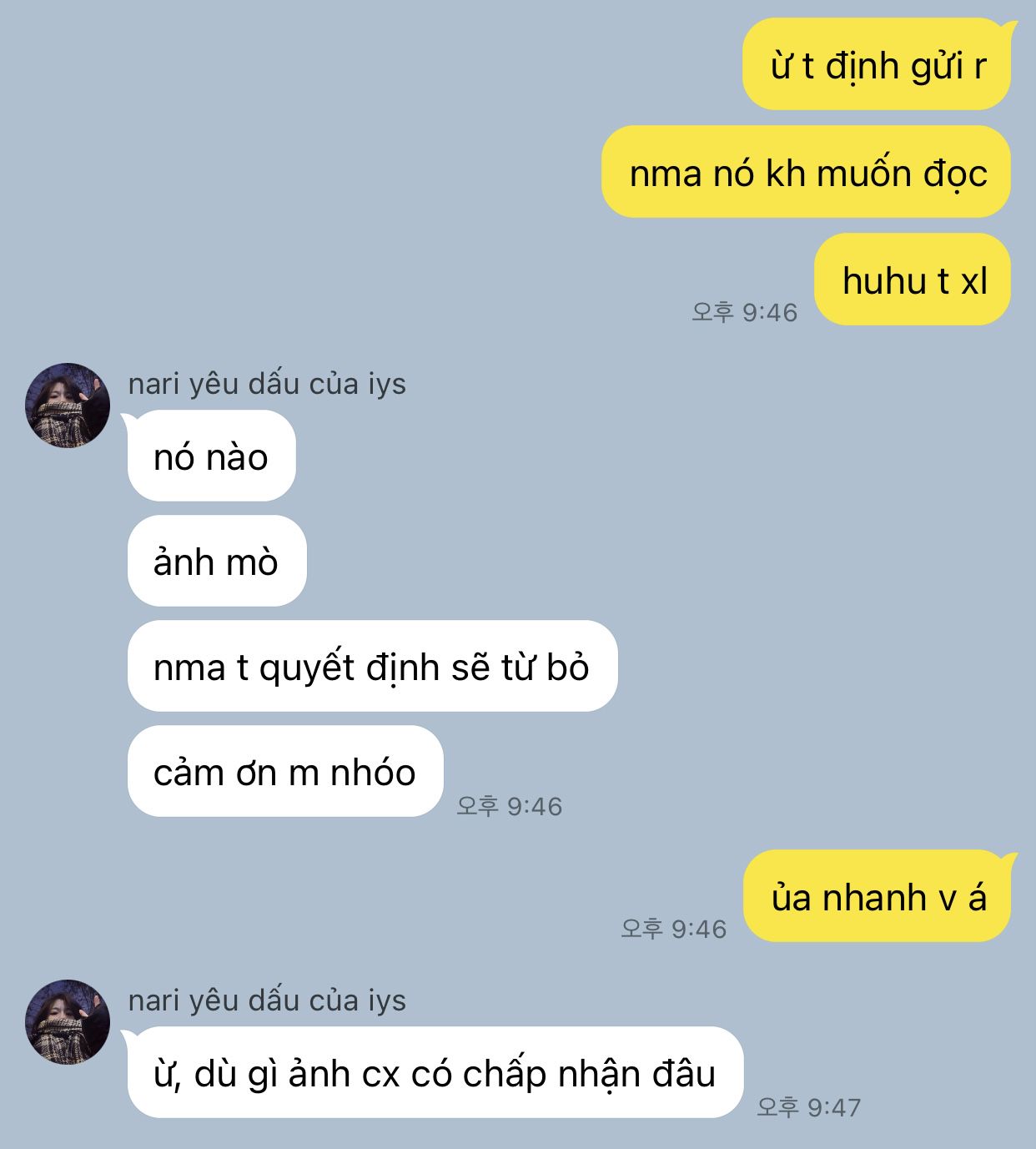 em nhìn tin nhắn, lòng chùng xuống. em không muốn... nhưng cũng không nỡ làm nari buồn.