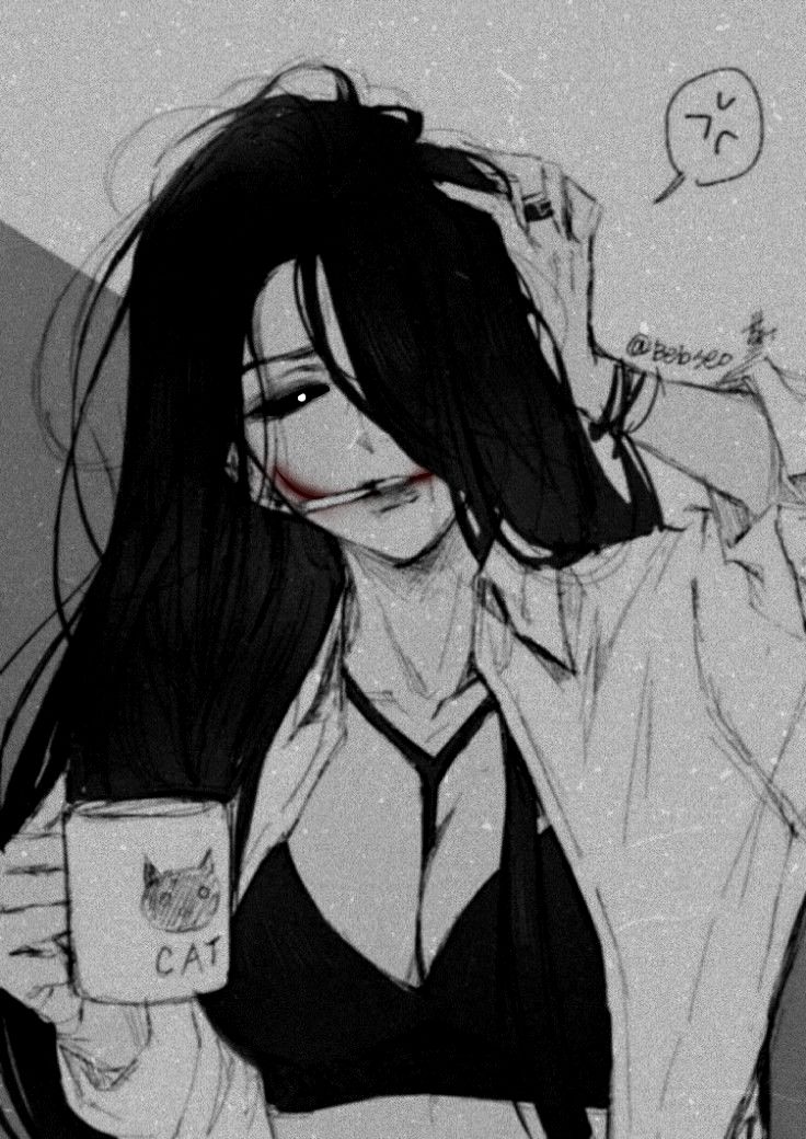 Her skin is very pale, basically of a white colour. Her black hair is quite long and messy, since she hasn't cut it since she's been dead and she just doesn't really care about her hair either. The characteristic that probably makes her stand out the most are her eyes. They're fully black and only the tiny pupils are white.