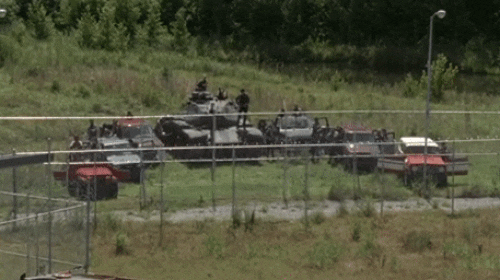 "Get back!" Rick exclaimed at a couple of prison dwellers who were outside. They listened and ran out of the area. The group stood by the fence and looked out, seeing several cars on the field outside the prison...along with a tank.