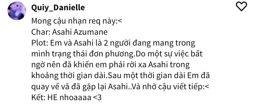 Tadaa, ít thấy ai đặt request về Asahi, mong các cô sẽ hài lòng chap này. Bởi ta nói hai người yêu nhau thì dù có cách xa vạn dặm muôn khơi như nào đi chẳng nữa thì cuối cùng cũng về bên nhau thôi.