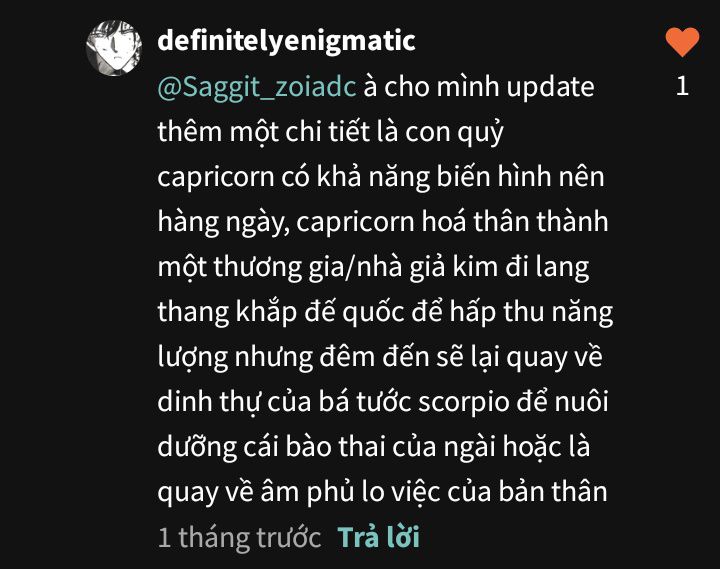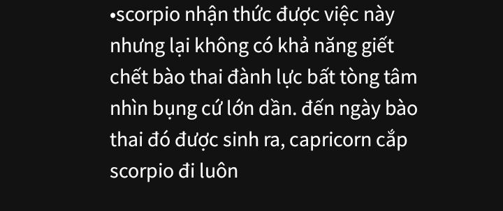 Scorpio ôm bụng, cảm nhận bào thai bóng tối chuyển động, nhịp đập mạnh mẽ, như nhắc nhở hắn rằng gã vẫn luôn hiện diện, nhưng Gemini vẫn bên cạnh, như một chỗ dựa nhỏ bé nhưng đầy sức mạnh. Hắn biết, lựa chọn phía trước sẽ không dễ dàng, nhưng ít nhất, hắn vẫn còn có thể… cố gắng.