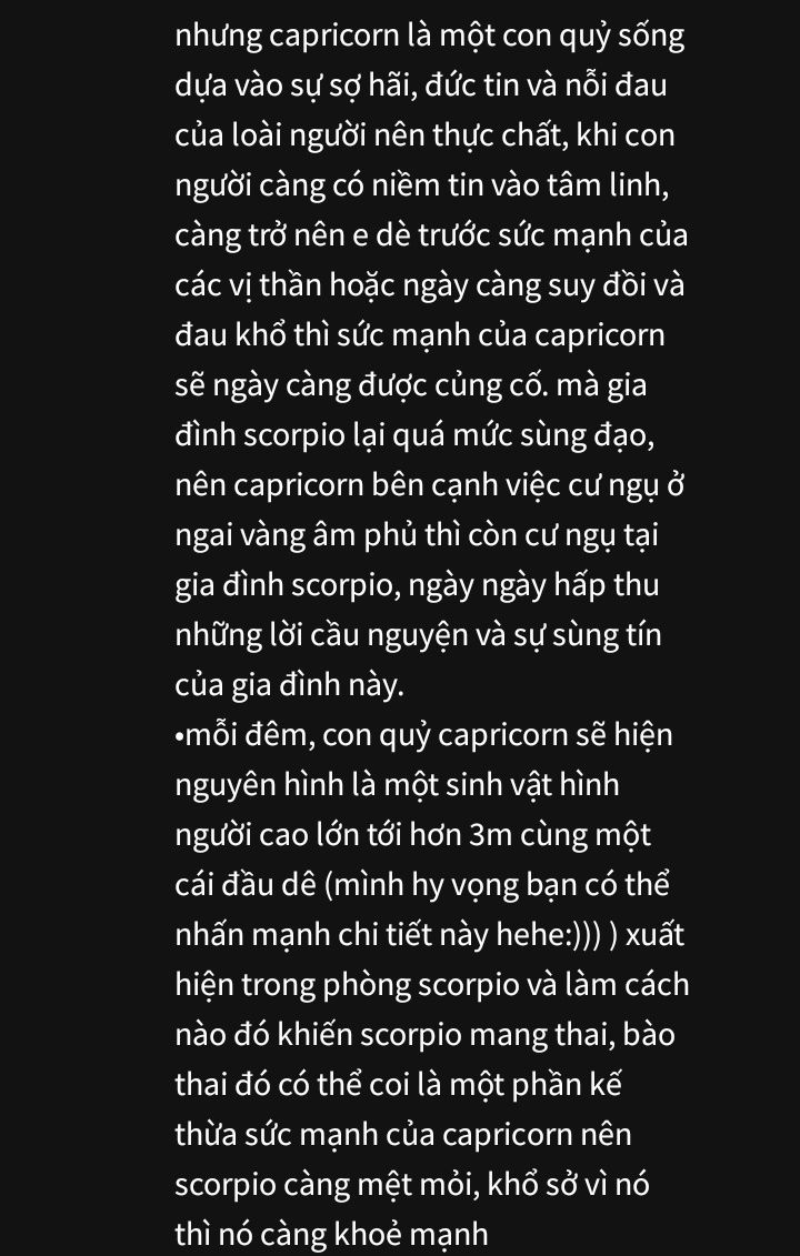Capricorn cười, âm thanh vang vọng, cuốn theo bóng tối và ánh trăng, xóa nhòa ranh giới giữa hai linh hồn. Trong khoảnh khắc ấy, Scorpio nhận ra, không còn ánh sáng nào có thể cứu hắn, chỉ còn Capricorn cao hơn ba mét, đầu dê nhọn, đôi mắt đỏ rực soi thẳng vào trái tim hắn, chiếm lĩnh mọi suy nghĩ và cảm xúc.