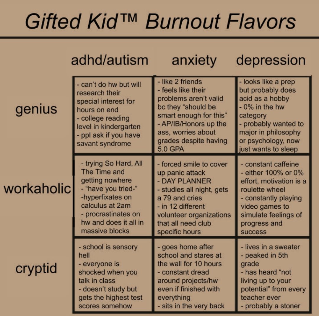 Tag urself, I'm adhd workaholic and genious. Also, last year I was depression cryptid. And anxiety genious.