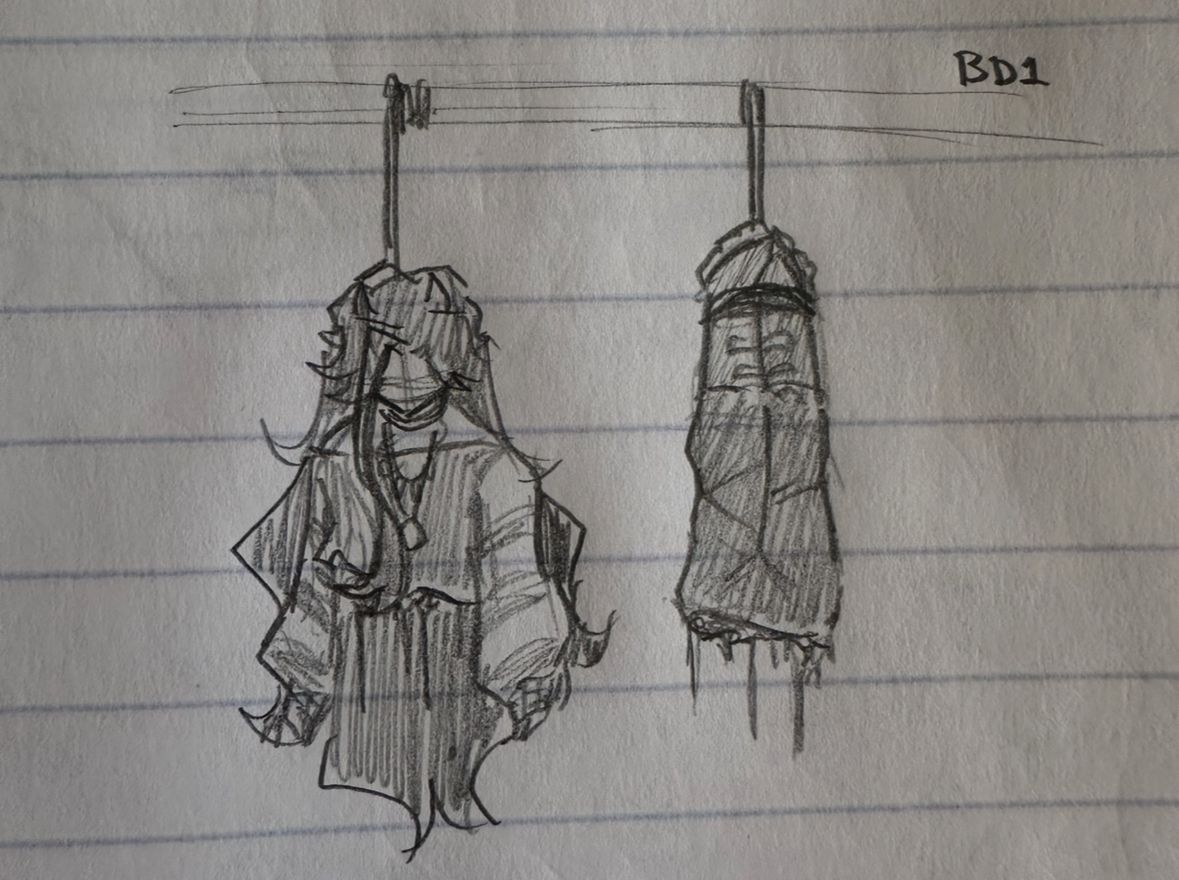Essentially Flauros offered to do a seance with someone, that person hit him in the back of the head with something that left long, thin indents. They then used a meat saw from the kitchen to saw him in half, and two jump ropes to hang the two halves (they used the pulley system because their weak ass can't lift half a dead body). They also used a stack of chairs to reach the ceiling beam to secure the knot. After that, they used a spell to get into the incinerator and burn Flauros's seance materials because they were unholy.