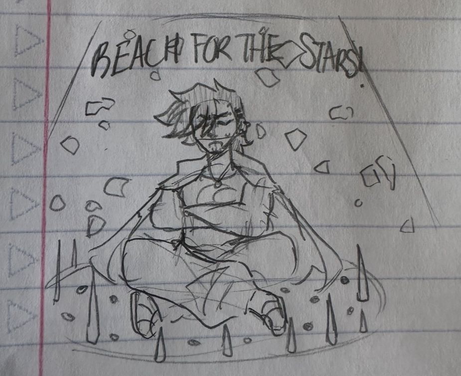 Kai sits in an observatory kind of room with a glass dome ceiling hundreds of feet up, the stars above him casting dots of light on the floor. Around him, the hundred-foot tall walls are covered in rocks in clusters like constellations. The floor beneath him slides open to reveal a layer of spikes pushing through slowly. Kai scales the rock wall as the spikes slowly rise below him. He pushes through exhaustion, pushes through when some of the rocks tase him or are blistering hot. Finally, he makes it to the top, where he sees an EXIT sign. As soon as he uses the last of his strength and pulls himself up over the edge of the rock wall, the ground shakes violently, throwing him back into the pit and impaling him on the spikes.