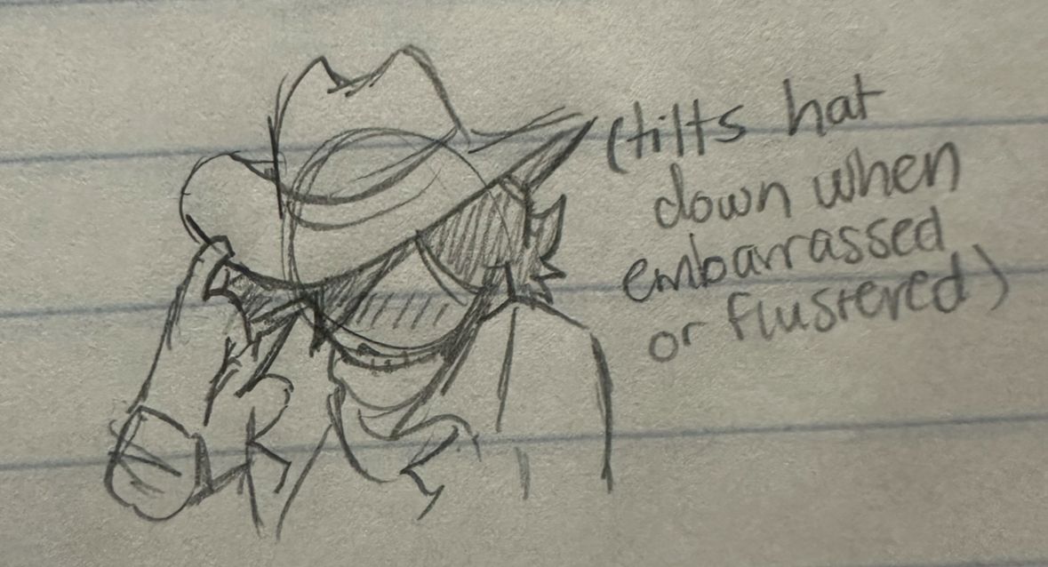So fun fact I have actually been wearing a cowboy hat during sessions and it has made me realize how expressive a fucking HAT can be. Started practicing drawing a little with that in mind