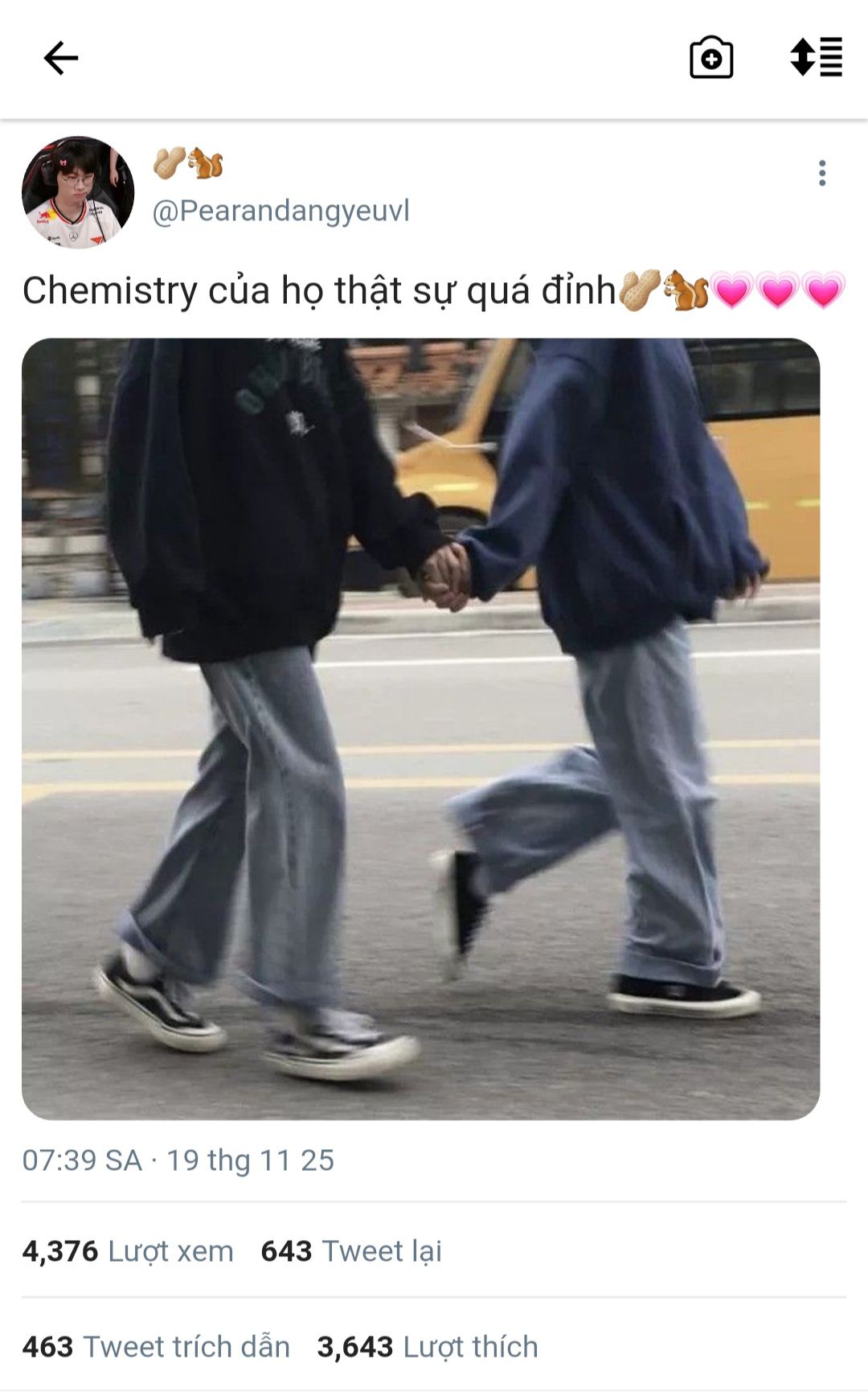 Mặt Mun Hyeonjoon lại đen thêm một chút khiến Choi Wooje đổ mồ hôi hột. Ghé mắt vô xem thì thấy trên màn hình chiếc điện thoại đời mới nhất của Mun Hyeonjoon là tấm ảnh đang viral khắp cõi mạng xã hội sáng nay. Tấm ảnh chụp Choi Hyeonjoon và Han Wangho đang nắm tay nhau chạy trên phố. Dù chỉ là ảnh chụp từ phim trường, chất lượng không quá cao, nhưng cái gọi là chemistry giữa hai người họ dường như tràn ra khỏi màn hình. Ánh nắng vàng ươm, nụ cười rạng rỡ của Choi Hyeonjoon, và ánh mắt thâm tình của Han Wangho. Dưới phần bình luận, hàng nghìn con người đang gào thét. Hèn gì sếp của cậu ỉu xìu như cái bánh bao chiều thế kia