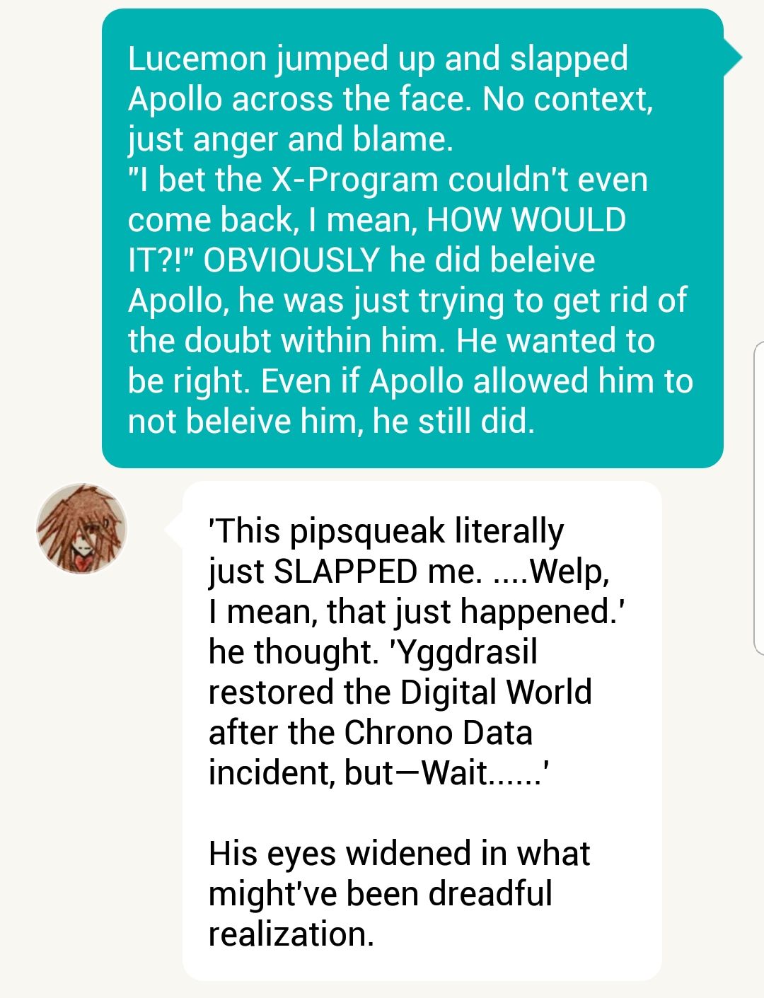Lucemon: *almost killed Apollomon and Kaze earlier*Lucemon: *slaps Apollomon across the face*Apollo: Pipsqueek.