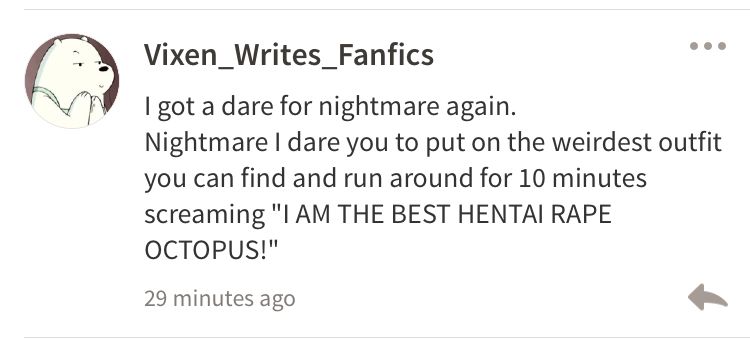 Nightmare:*in a sexy barbecue chicken outfit, running around the house* IM THE BEST HENTAI RAPE OCTOPUS :D
