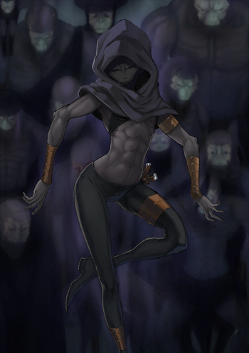 Astolfo then got up & lead Khiry into the other room. Astolfo then opened the door for Khiry to see three all Hassan. One male & two females. One of the man's appearances is that of an extremely tall, slender, dark man with his right arm bandaged. His right arm is described by Saber as a useless flat board, incapable of doing much. His face is a skull resembling the mask with its skin and nose shaven off. The female is An assassin who wears a skull mask. Serenity's appearance is typical of those in her Assassin Order. Like all of the other Hassans, she wears a black, form-fitting outfit and the traditional Hassan's skull mask. Her outfit is very similar to the one worn by Asako of the Hundred-Faced Hassan, her violet-colored hair being another trait they share.