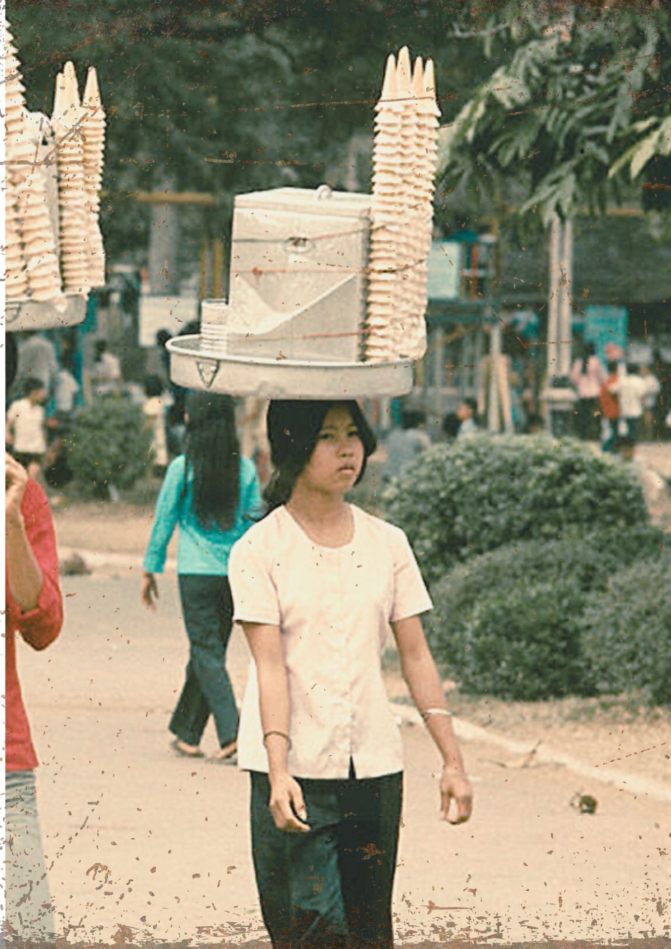 Đôi nam nữ đang trong hồi tán tỉnh vui vẻ, bỗng một con bé bán hàng rong trờ tới. Đầu nó đội một mâm bánh ốc quế được chất chồng cao ngất, tay xách một cái thùng sắc đậy kính. Chiếc miệng nhỏ của nó dẻo quẹo mời chào: