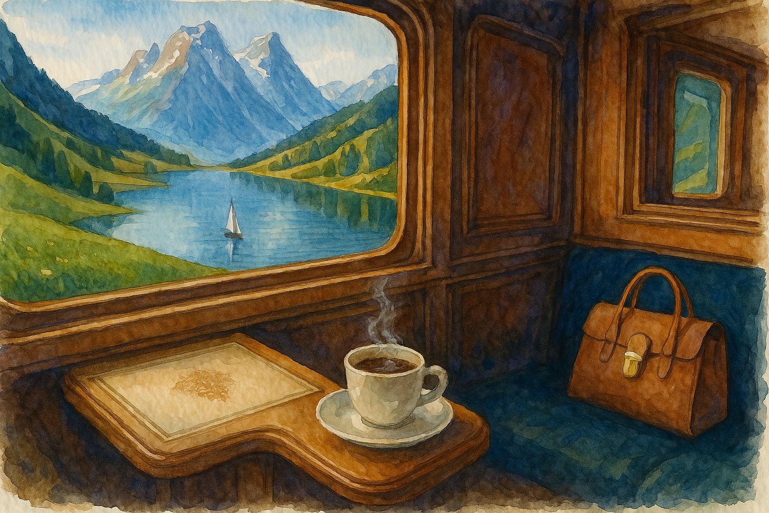 Tàu Golden Pass Belle Époque lướt nhẹ trên những đường ray uốn lượn, như một vũ điệu chậm rãi giữa lòng thiên nhiên Thụy Sĩ tráng lệ. Bên ngoài khung cửa sổ rộng lớn, phong cảnh hiện lên như một cuốn tranh thủy mặc sống động, từng nét vẽ được tô điểm bởi bàn tay tài hoa của tạo hóa. Những thung lũng xanh mượt trải dài bất tận, phủ lên mình tấm áo cỏ non mềm mại, điểm xuyết bởi những khóm hoa dại rực rỡ: vàng tươi của hoa bồ công anh, tím dịu của oải hương, và đỏ thắm của những bông anh túc nhỏ xinh. Gió khẽ lùa qua, khiến cánh hoa đung đưa nhẹ nhàng, như thể chúng đang thì thầm trò chuyện với nhau trong ánh nắng chiều dịu dàng.