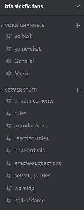 they also have a "creative-contributions" chat, which is the same as my "armys-creations" chat, "selfie-central" which is the same as my "selca-channel", they have chats for all the members and an OT7 chat, just like i do. They have a support area, that also has support tickets and two rant chats.