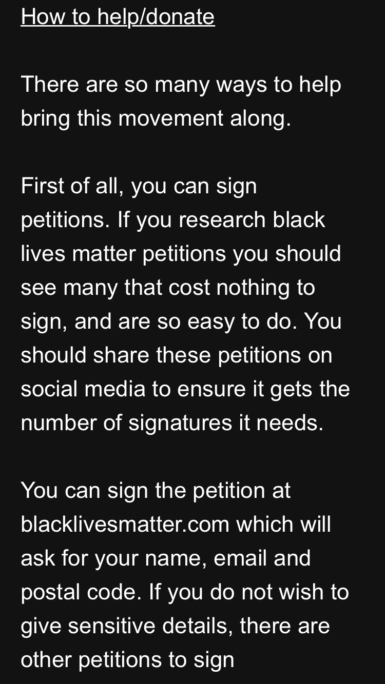 Anyway, I'm not great at talking about this stuff cause I'm white and privileged and have no clue what it's like, but can I please direct you to my good friend LittleSpoonSebastian 's book, where they wrote about their experience as a poc, and also provided some good ways to support the #blacklivesmatter movement, which I will add screenshots of here but please just go read their chapter and give them some love if you haven't already please and thank you 💜