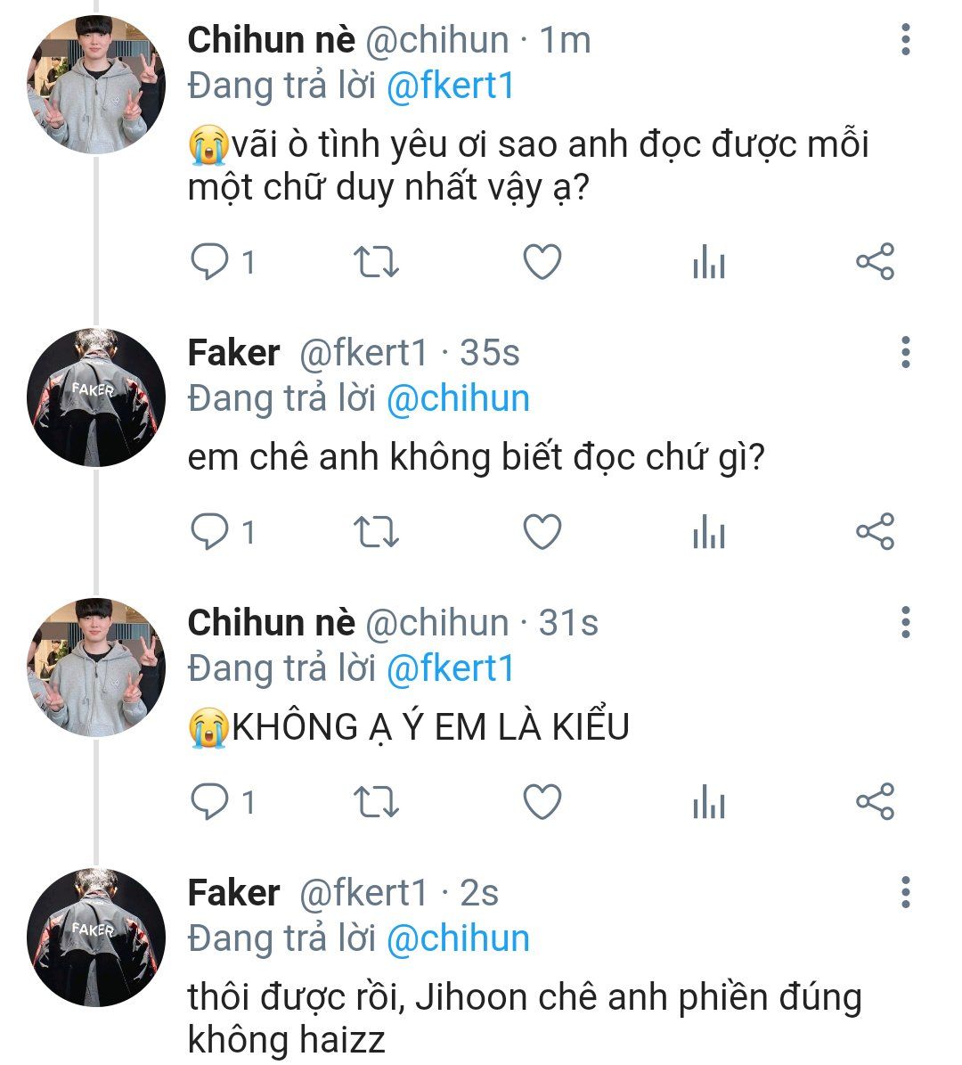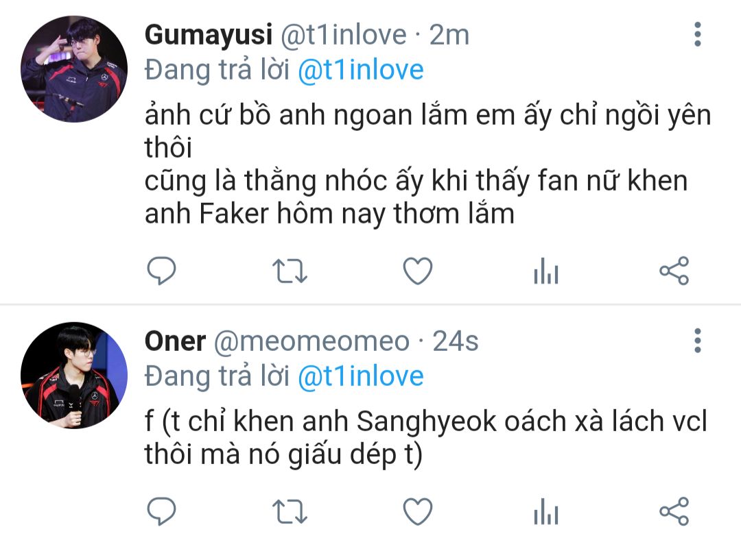 Jeong Jihoon vẫn chọn mặc kệ, cảm giác khó buông bỏ được một người ngay cả khi người ấy có nguy cơ chẳng đẹp là sao nhỉ? Là yếu lòng chứ còn gì nữa, nó thích Faker vì con người của Faker và Lee Sanghyeok hay Faker chẳng phải là đều cùng một người cả sao?