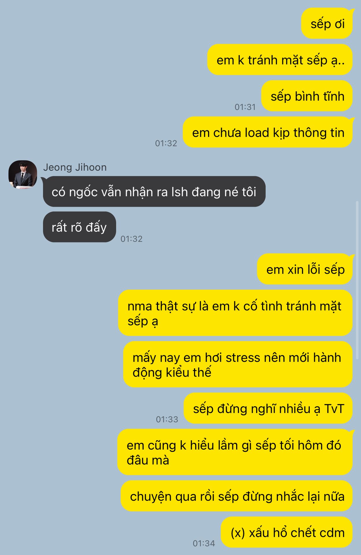 "đừng nghĩ nhiều nữa, chuyện đó không ai sai cũng chẳng ai đúng, nhưng cậu kim đấy cũng hơi đụng chạm quá rồi