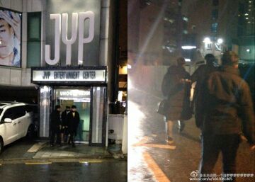 Cách đây ít lâu, một fan của BTS đã ghi lại được hình ảnh JungKook bước ra từ tòa nhà trụ sở JYP Entertainment vào ban đêm, xung quanh anh chàng là rất nhiều nhân viên, quản lý của mình. Gần đây BTS không hề có một dự án nào kết hợp với JYP, phải chăng anh chàng đến đây là để gặp người thương?