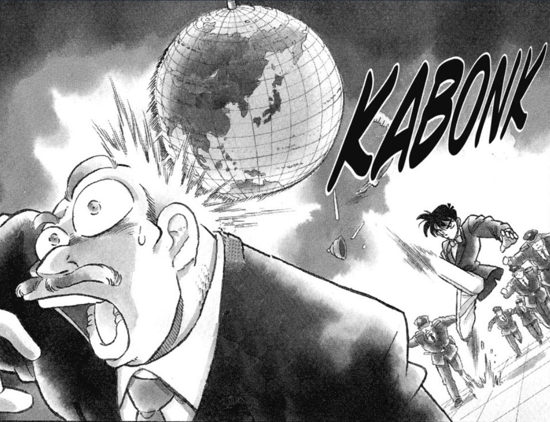 Ông ta cố gắng bỏ chạy, nhưng bị Shinichi cản lại bằng cách sút quả địa cầu thẳng vào đầu theo phong cách bóng đá: Vào!