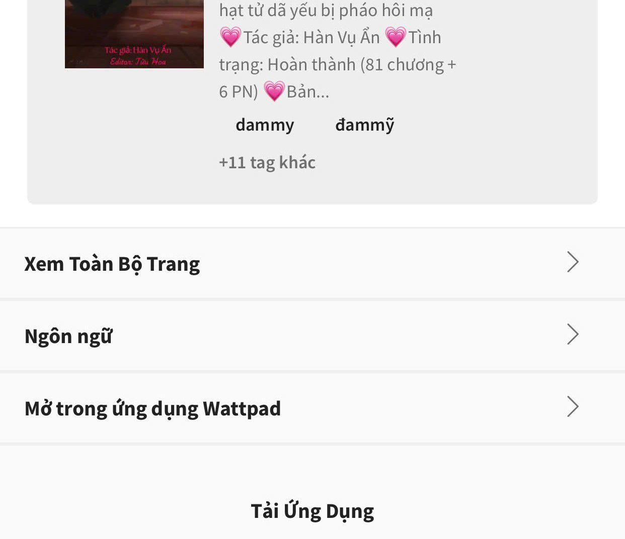 *Lưu ý: T phát hiện ra là 1 số chương dài khi đọc bằng trình ứng dụng mobile trên đth thì sẽ bị mất 1 phần không hiển thị, mọi người thấy chương nào tự dưng cụt cụt, thiếu thiếu thì tua xuống, vào "Xem toàn bộ trang" để chuyển sang trình duyệt web thì mới đọc được full nhé.