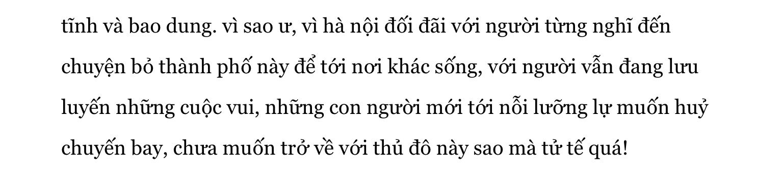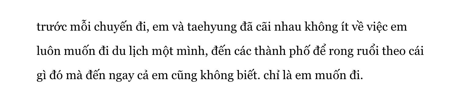Nội dung fic theo tớ thấy thì chủ yếu xoay quanh nhân vật nữ chính (mà ở đây không được đề cập tên), sau những tháng ngày đi du lịch một mình ở nơi đất khách quê người, đã trở về Hà Nội, thành phố thủ đô nhộn nhịp mình hằng yêu quý, về với anh người yêu, cũng là một giáo viên dạy văn, Kim Taehyung. TV theo vietnam hay hanoi!au, đúng hơn thì bối cảnh của fic là ở Hà Nội. Đã kha khá số người viết theo kiểu này rồi, nên đây không phải là chủ đề mới mẻ cho lắm. Tuy nhiên, việc khai thác câu chuyện từ những thứ giản dị, gần gũi, thân thuộc, từ đó mang cho người đọc cái chân thành, mộc mạc xuất phát từ bên trong, cũng chưa bao giờ được coi là cũ. Mỗi người mỗi cách viết, cảm xúc khác nhau, rõ là sẽ mang một màu khác nhau. Có thể nói rằng, đây là một style vừa cũ cũng vừa mới. Tớ dành điểm cộng cho plot của cậu. Lý do thì, tớ vốn rất kết hanoi!au (dù tớ chẳng hiểu rõ lắm về Hà Nội), và tớ thấy, việc cậu chọn một plot kiểu này khá thông minh. Sẽ có nhiều người chuộng, vì văn chương khá dễ ngấm, hoà hảo. Vẫn là nghiêng về bản thân tớ nhiều hơn.