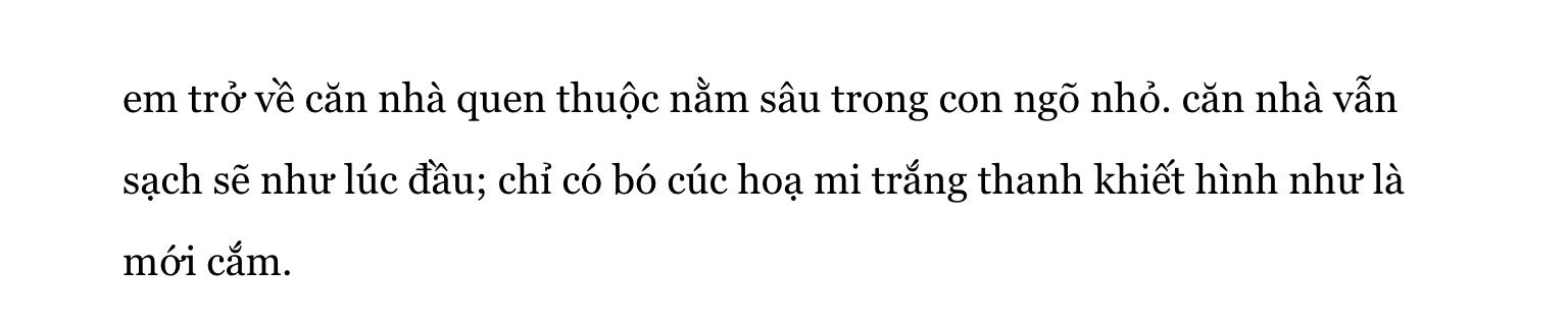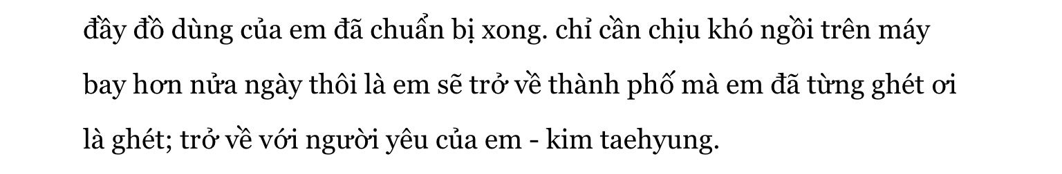 Tiếp, về diễn biến cũng như khắc hoạ nhân vật trong TV. Như cậu đã nói lúc đặt đơn, plot đơn giản, nên diễn biến cũng vậy thôi. Toàn bộ là cảnh nữ chính trở về, cảnh phố phường hà nội, ngôi nhà của nữ chính với anh người yêu... Diễn biến thế là quá ổn, ta thấy rồi đó mà, nên không cần nói nhiều. Nhân vật thì, qua câu chuyện, ta thấy được, nữ chính, cô gái thích đi du lịch, khám phá, thích được chiều chuộng, đôi khi bướng bỉnh nhưng cũng dễ yếu đuối. Taehyung, nam chính, giáo viên dạy văn, anh chàng yêu cô nữ chính, rất mực quan tâm cô, có phần tinh nghịch. Hình mẫu nhân vật dễ gặp ở bất cứ đâu. Tớ thích ngắn gọn không dông dài, nên 'no comment' với tuyến nhân vật của cậu. Nếu cần nói quá ấy, tớ có một câu sau: Cặp đôi trong TV mang đến cho tớ một cảm giác dễ chịu, yên bình. Cách họ yêu nhau, nhung nhớ, đùa nghịch, đích xác là một đôi 'chuẩn'. Nhân vật chẳng có vấn đề gì cả, vì riêng tớ cho rằng, nó có thế nào đi chăng nữa, phụ thuộc cao vào văn phong, phần tớ chuẩn bị nói dưới đây.