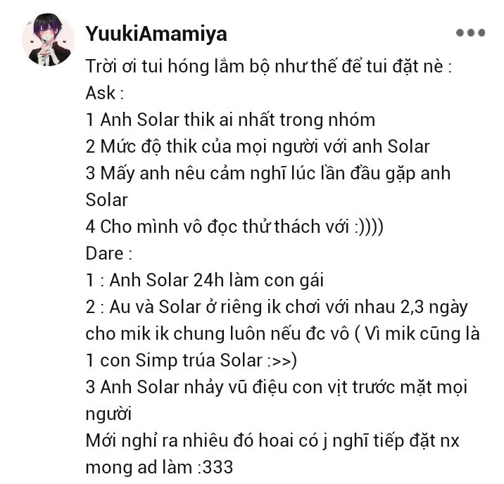 Yuuki : giờ hãy tới phần thử thách nào, thử thách thứ nhất : Anh Solar 24h làm con gái :))