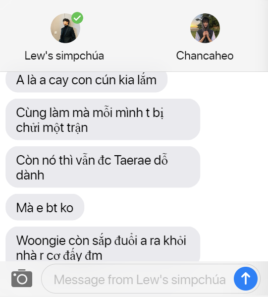 Bọn a đã thách e ấy phải tán đổ Binie hyung nếu ko thì e ấy sẽ phải ngoáy mông trc toàn trường. Nhưng khi Jae Won tiếp cận đc a ấy thì bọn a thấy e ấy chỉ có ý định tán vui chứ ko muốn chịu trách nhiệm nên bọn a đã nhận ra sự ngu ngốc của mình khi đưa nhiệm vụ đấy cho ẻm. R bọn a đã cố gắng ngăn cản nhm ko đc. Tính e ấy từ đầu đã rất hiếu thắng r nên sẽ lm điều này tới cùng. A sợ Binie hyung sẽ bị tổn thương nên mới nhắn cho e để bảo vệ a ấy nữa. A biết mình sai r, a cũng biết a ấy quan trọng với bọn e đến nhường nào, a xin lỗi e nhiều lắm. E muốn a làm gì cũng đc, a có thể đến xin lỗi Hanbin hyung nhưng a chỉ mong e có thể giúp a bảo vệ a ấy. A ko muốn a ấy bị tổn thương đâu.