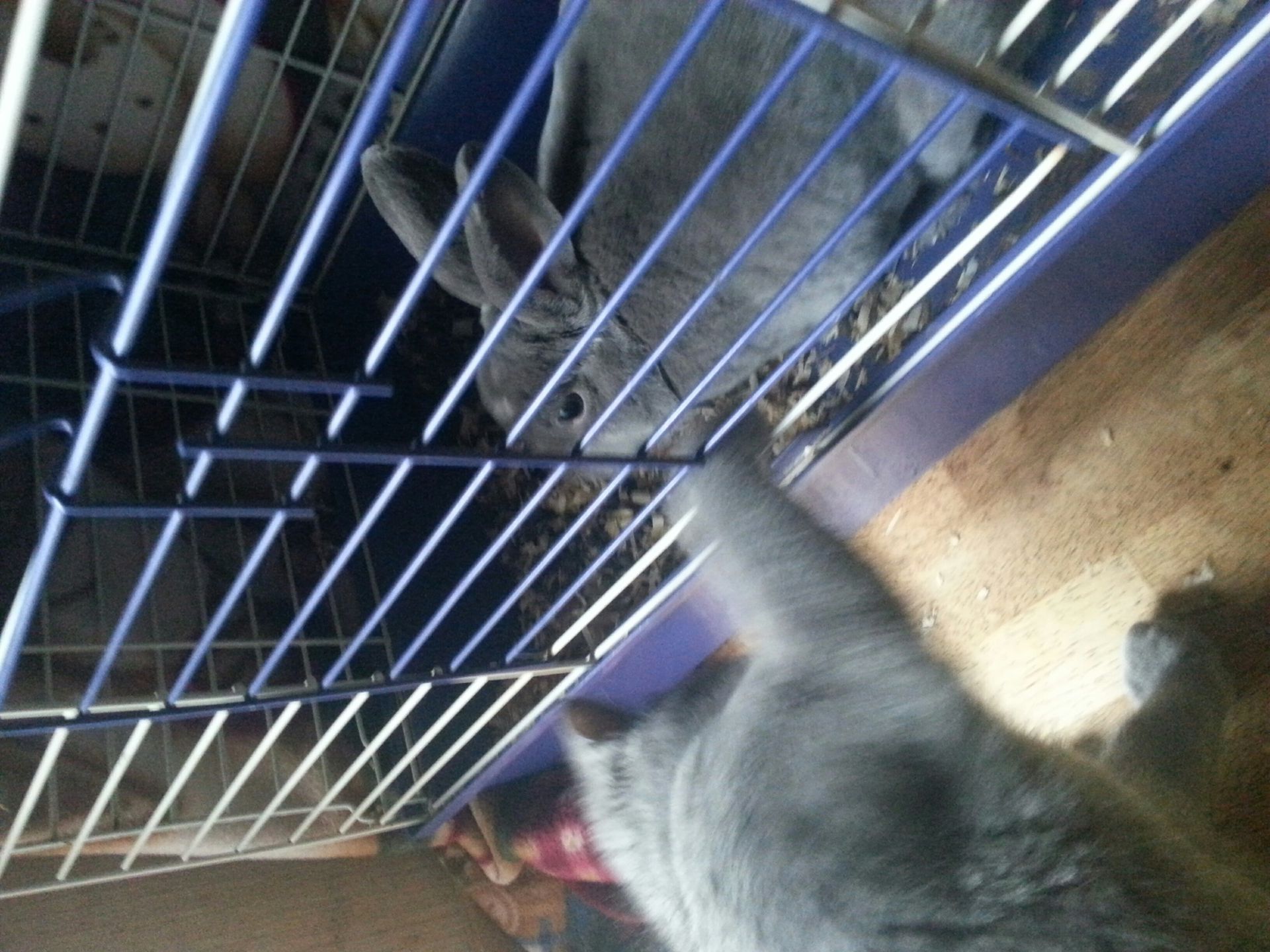Yes, one's on top of the rabbit's cage and the other is trying to get the rabbit inside said cage