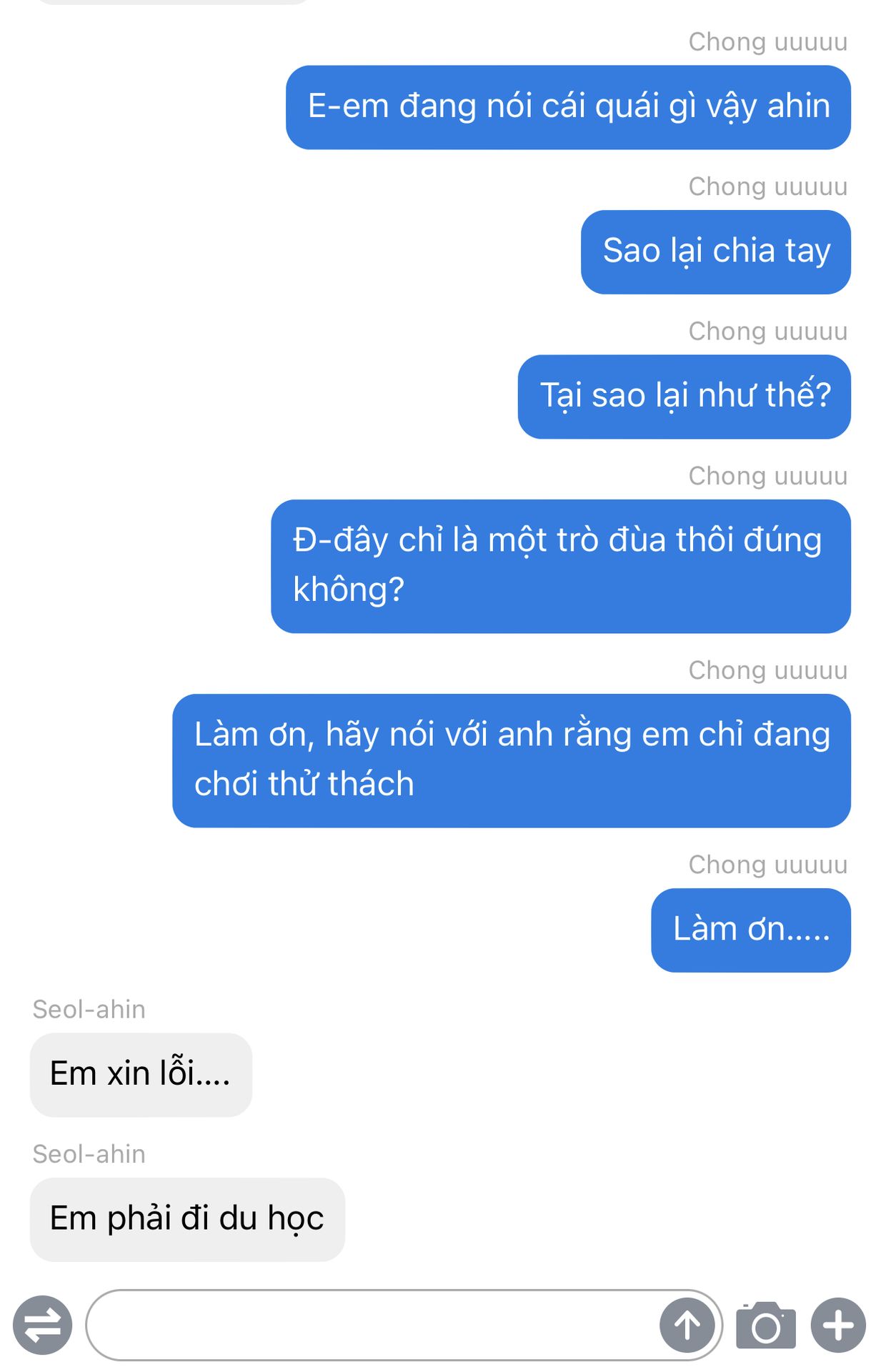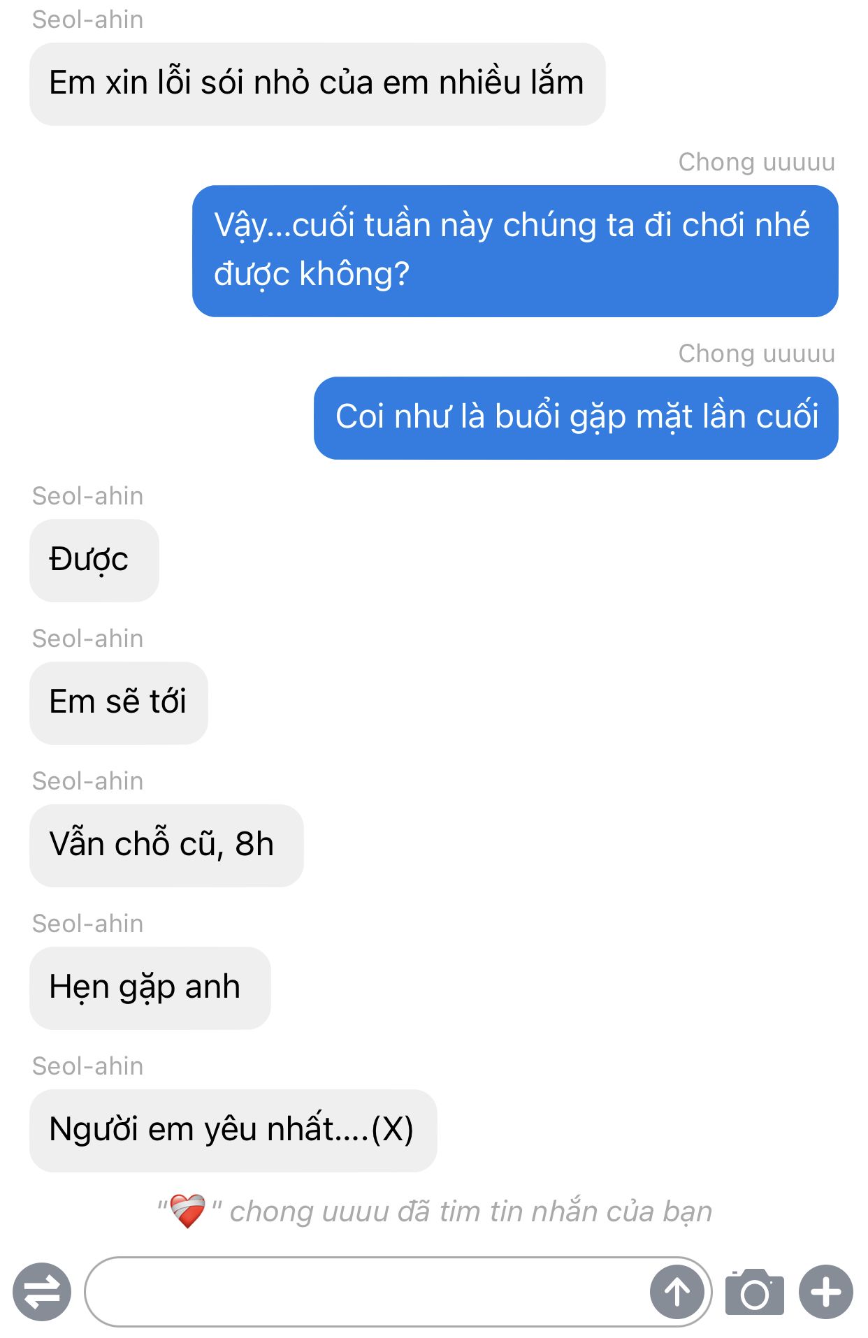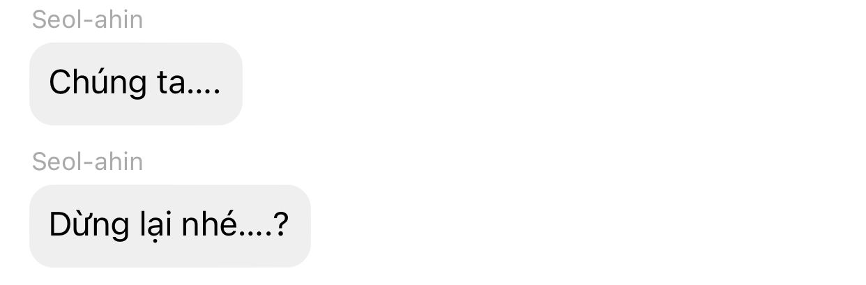À quên mất, mải kể chuyện cho mọi người mà tôi quên giới thiệu em: em ấy tên là seol-ahin, kém tôi 1 tuổi, bố mẹ em vì đi làm xa mà để em lại sống một mình ở seoul rộng lớn cùng với mụ giúp việc, dù vẫn chu cấp đầy đủ nhưng bố mẹ không biết rằng em bị bạo hành bởi cô giúp việc ( tôi là người đầu tiên được em kể cho đấy). Thi thoảng tôi ngủ lại nhà em vài hôm vì những tên nợ đến đòi tiền mẹ tôi, chúng làm ầm ĩ lên khiến tôi phải đi ngủ nhờ nhà em. Tôi rất đoàng hoàng để em ngủ trên giường còn tôi nằm ở sofa đó. Thì cũng là những hôm tôi ngủ nhờ nhà em tôi mới biết được rằng em đang bị bạo hành bởi mụ giúp việc chết tiệt ấy. Tôi đã giúp em giải vây, khuyên em gọi cho bố mẹ đuổi việc ả đi vì nếu để lâu dài em sẽ chết mất.