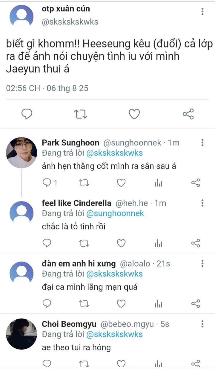 Heeseung mắt liếc liếc qua Jaeyun , xong hắn thò tay vô túi quần lấy bảng tên ... Nhưng không may làm nó rơi xuống đất , vậy nên... Hắn nhảy ra khỏi bàn rồi ngồi xuống lấy bảng tên và đưa cho Jaeyun... Nhưng ý ở đây là...