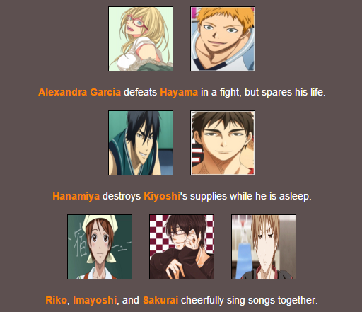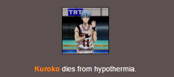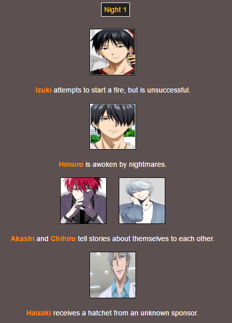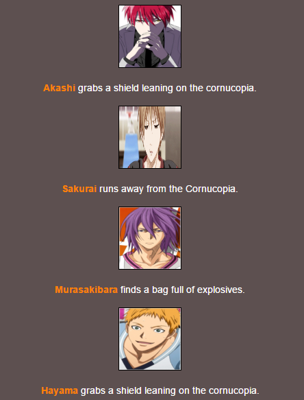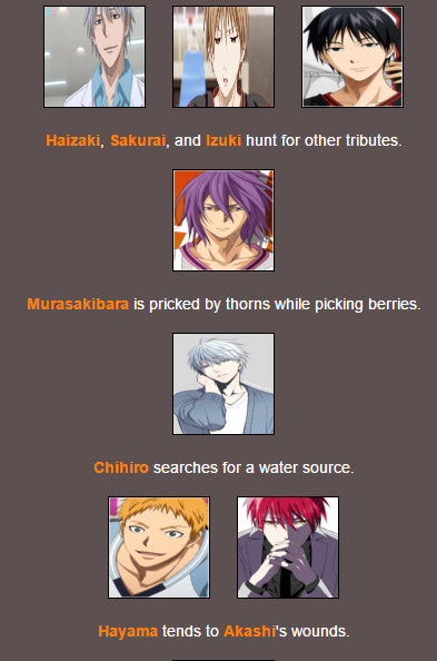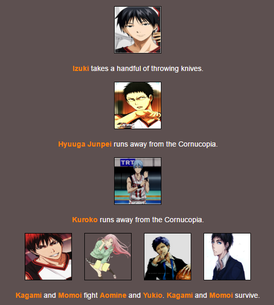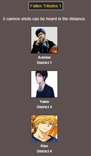 Thôi, nghiêm túc. Dự án lần này có tên là Kuroko no Hunger Game. Nó là một crossover giữa Kuroko no Basket và The Hunger Game. Cho những bạn nào chưa xem/đọc The Hunger Game; hay tiếng Việt còn dịch là Đấu trường sinh tử, Ame xin được nói qua về luật chơi. Có 12 quận và mỗi quận sẽ cử một nam, một nữ để làm Vật tế (nhưng do KuroBas toàn mấy thằng đực rựa nên Ame cho bọn nó chung một quận hết cả rồi :v). 24 Vật tế của 12 quận sẽ được gửi đến một đấu trường và chém giết lần nhau cho đến khi còn duy nhất một người sống sót thì sẽ chiến thằng.