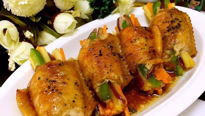 6 cánh gà chỉnh tề nằm trên đĩa, mặt ngoài phủ một lớp sốt mỏng, hiện ra màu hổ phách bắt mắt. Phần rau củ nhồi he hé lộ ra bên ngoài, xanh vàng đỏ trắng rực rỡ, cảnh đẹp vui ý. Lá cần tây ban nãy ngắt bỏ được Nhiếp Trạch dùng để trang trí xung quanh.