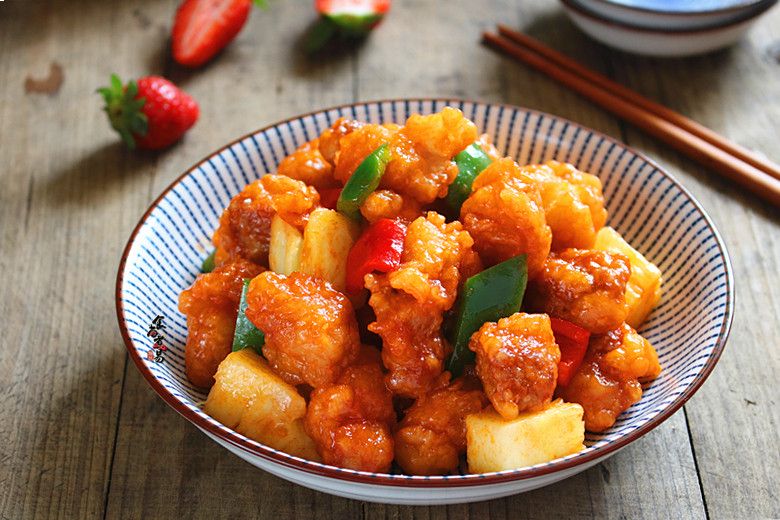 Trên tay Mễ Lộ cầm một quả thơm lớn, gọt bỏ vỏ, cắt miếng, thêm đường phèn vào đun thành nước xốt. Chung Cầm thì đang cắt ớt chuông xanh, đỏ, rồi lại đi trộn tinh bột cùng bột mì.