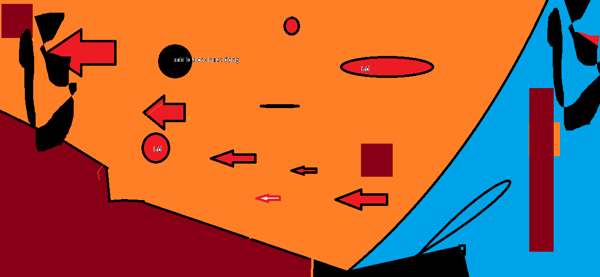 cái đó còn tên khác là hòn đảo núi lửa hoặc đảo nham thạch với độ nóng là trên 50 độ c còn mấy cục đen là obsidian còn màu đỏ tối thì nó là magma