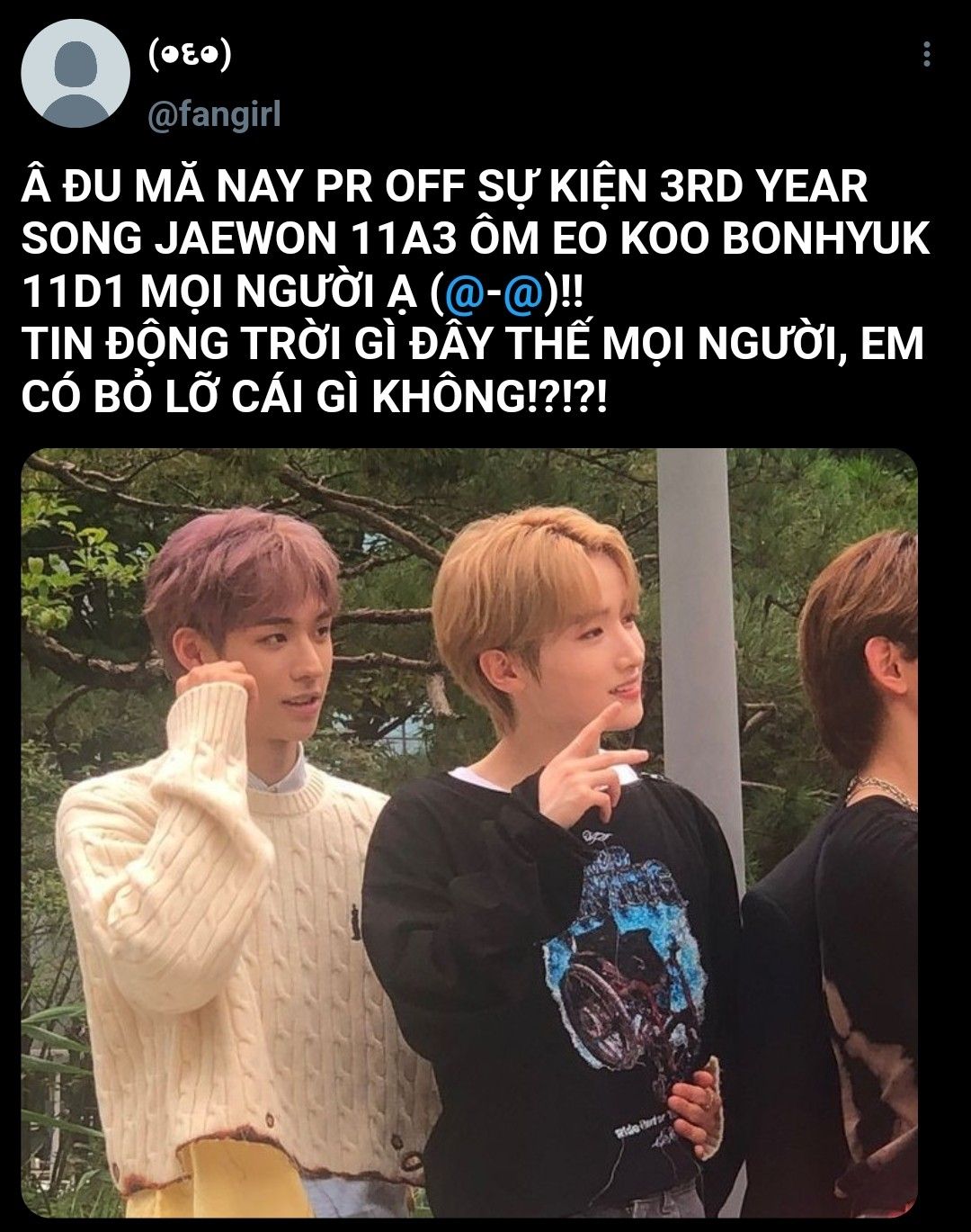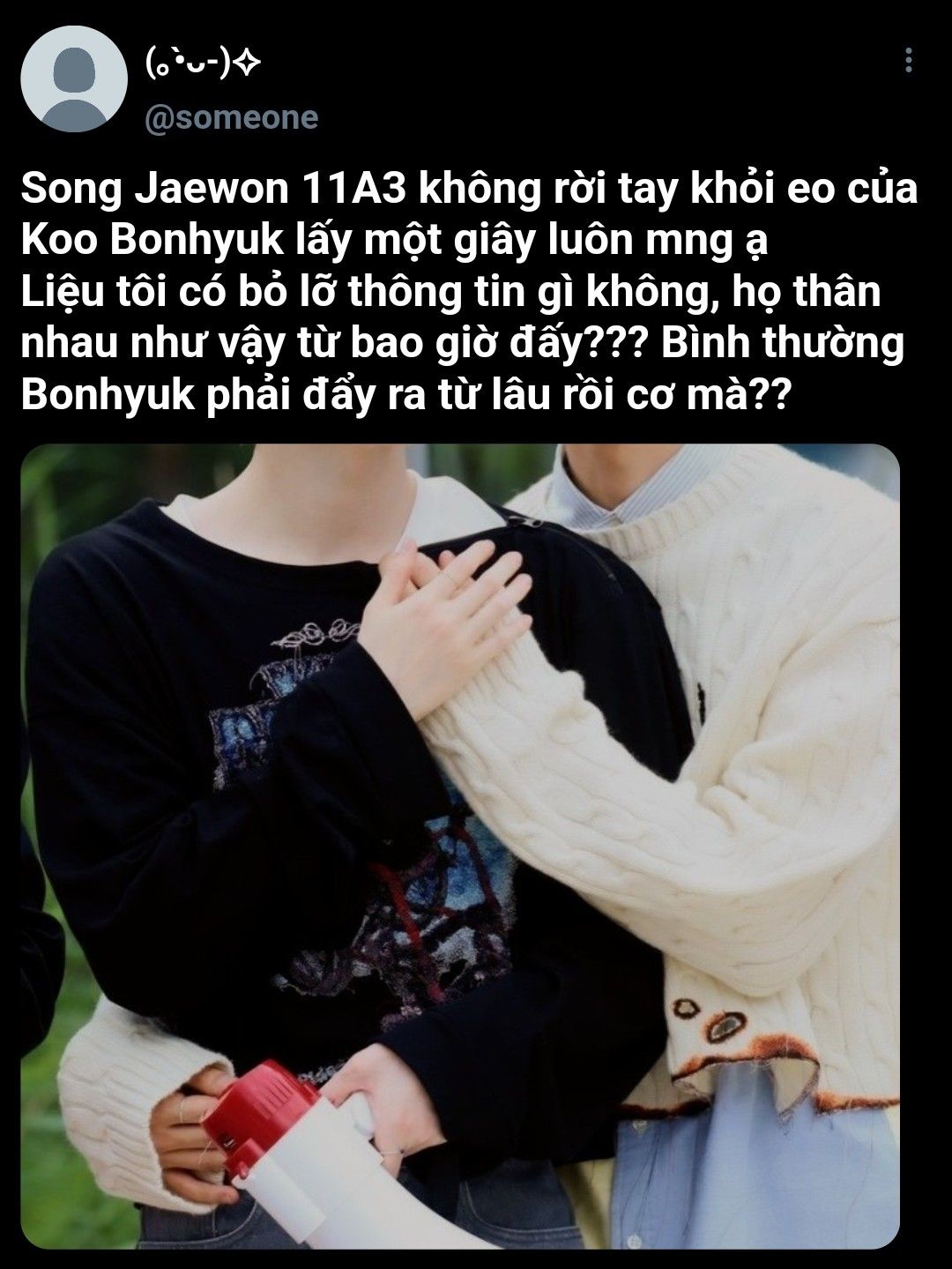 → @fangirl01: Lầu trên nói chuẩn, bình thường dù là anh Hyeongseop hay anh Euiwoong ôm là đã giãy ra rồi chứ đừng nói là Jaewon