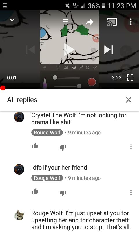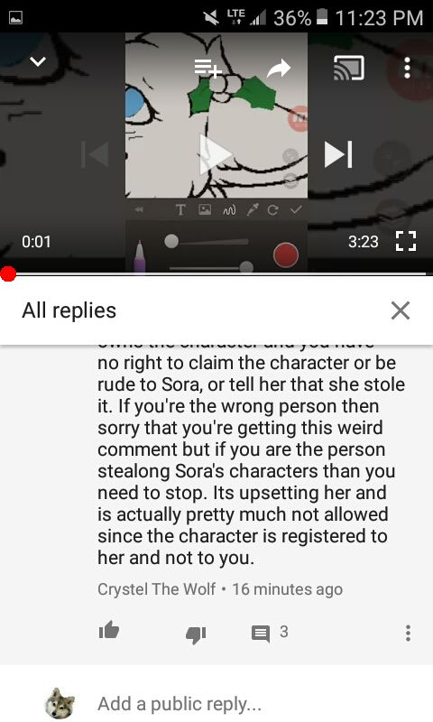 So this is a more serious update but it needs to be brought to attention. This has been brought up before but has resurfaced. A person on youtube under the username Rouge Wolf (though they may change it) is stealing SoraTheDutchie's character, Sora. Not only is this person commiting character theft (and being a total bitch about it) but Sora is registered among the official dutch angel dragon community so what this person is doing is not just wrong, but it's actually kind of illegal. I want to say I'm not calling a witch hunt on this person, but I guess I kind of am. This needs to be brought to attention. They tend to delete their own comments when confronted and will delete comments others make on their own video (they only have one at this point) if you bring it up. According to Sora they deleted my comment or she wasn't able to access it but i could still see my own comment and the replies they made so i screenshotted them.