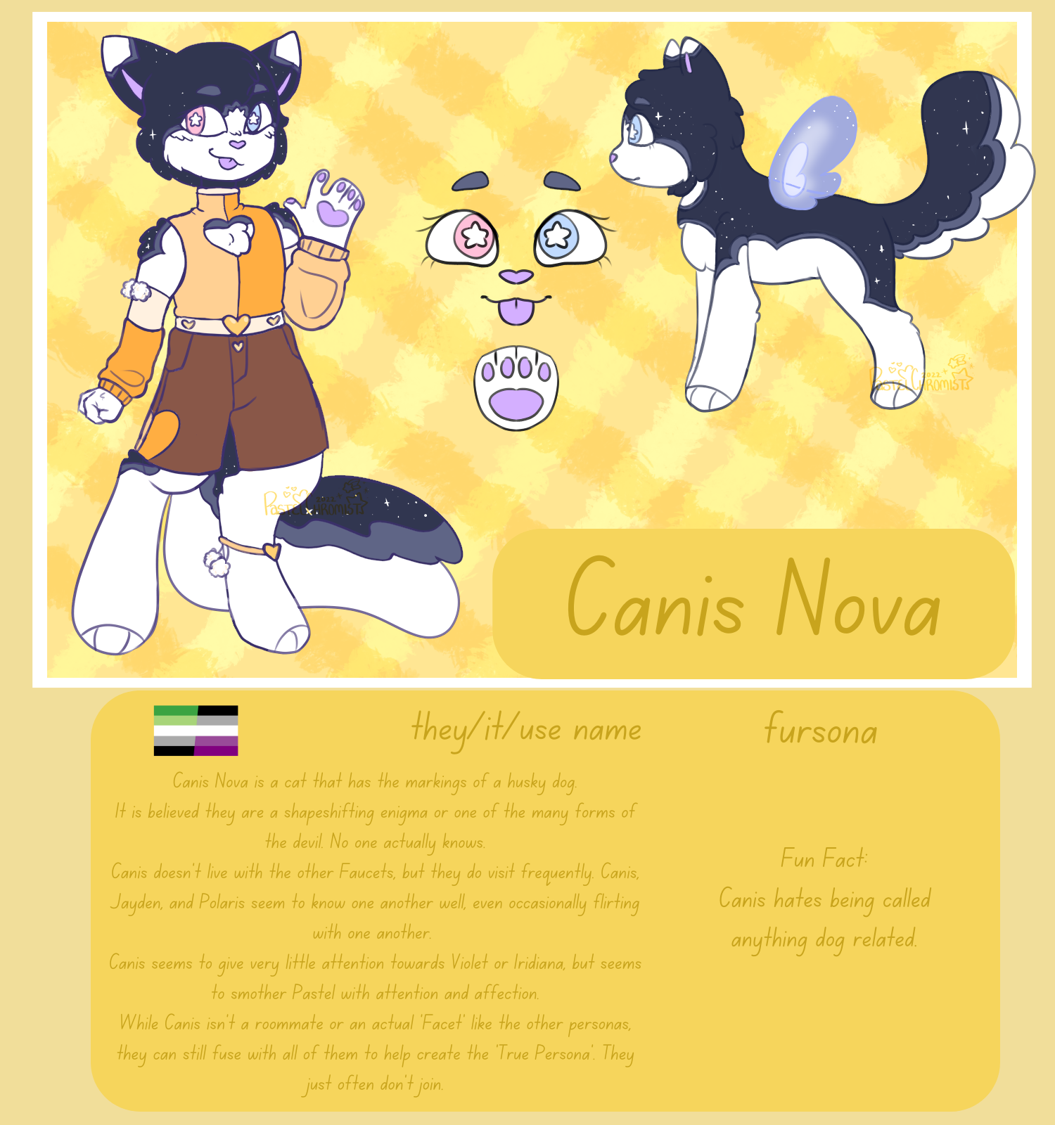 Canis Nova is a cat that has the markings of a husky dog. It is believed they are a shapeshifting enigma or one of the many forms of the devil. No one actually knows. They don't live with the other Faucets, but do visit frequently. Canis, Jayden, and Polaris seem to know one another well, even occasionally flirting with one another. Canis seems to give very little attention towards Violet or Iridiana, but seems to smother Pastel with attention and affection. While Canis isn't a roommate or an actual 'Facet' like the other personas, they can still fuse with all of them to help create the 'True Persona'. They just often don't join.
