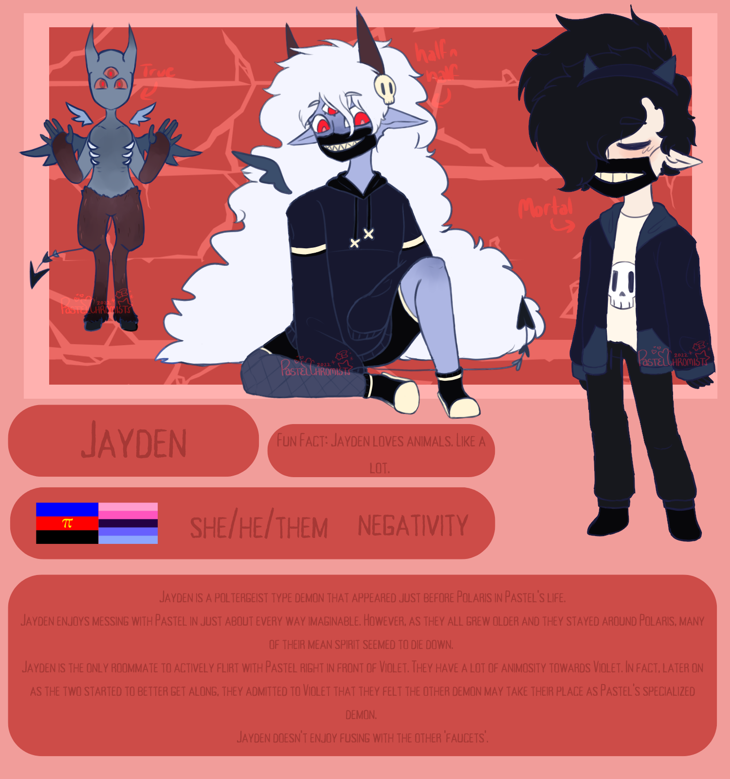 Jayden used to be called Jayda, but I decided I wanted something far more gender neutral since I have changed Jayden from non-binary to omnigender (they are a l l g e n d e r, very selfish demon >:0). Jayden didn't go through as many changes with their design or character, but I do like how I've wrote them.