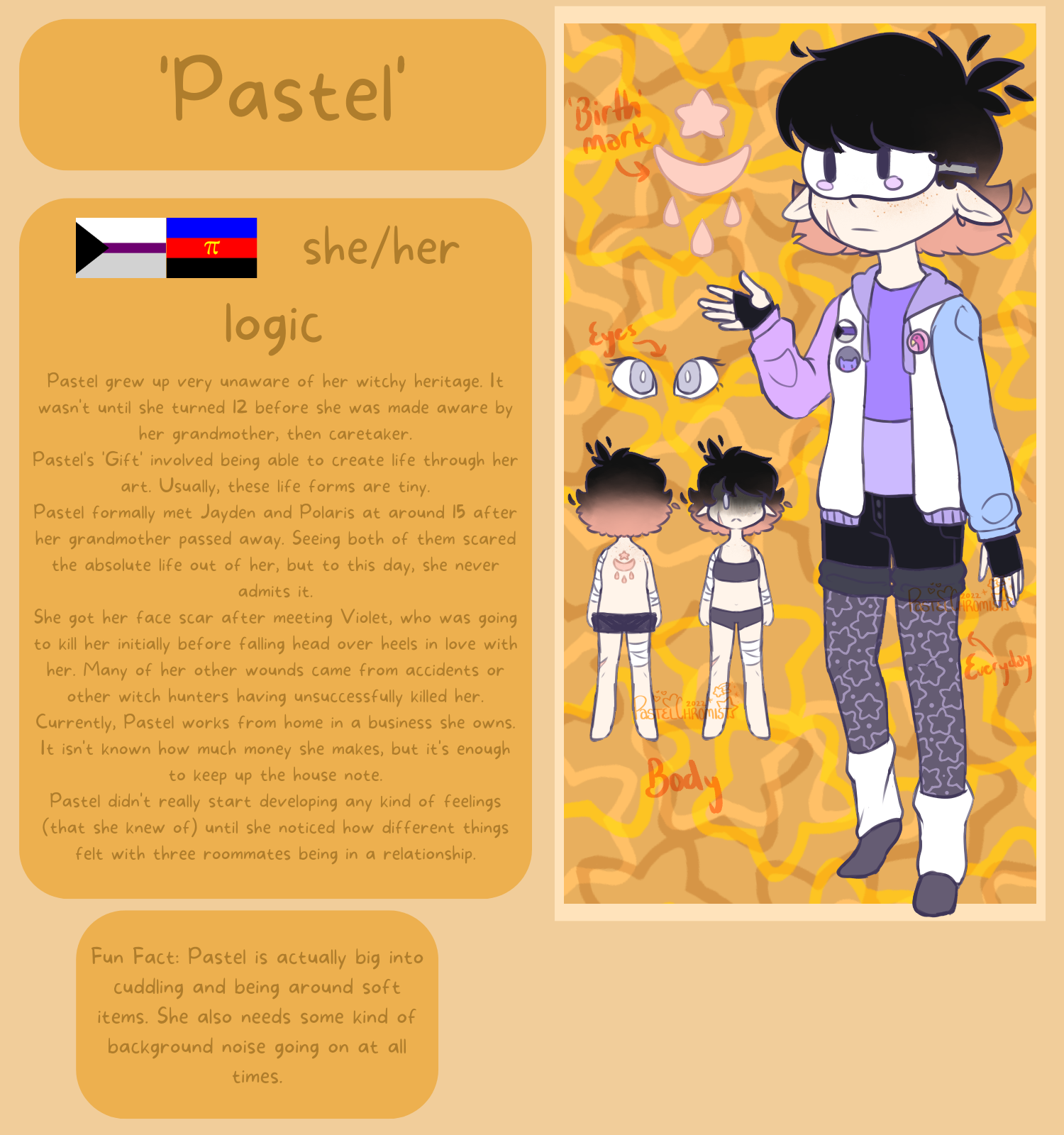 Pastel grew up very unaware of her witchy heritage. It wasn't until she turned 12 before she was made aware by her grandmother, then caretaker. Her 'Gift' involved being able to create life through her art. Usually, these life forms are tiny. Pastel formally met Jayden and Polaris at around 15 after her grandmother passed away. (Seeing both of them scared the absolute life out of her, but to this day, she never admits it.) Pastel got her face scar after meeting Violet, who was going to kill her initially before falling head over heels in love with her. Many of her other wounds came from accidents or other witch hunters having unsuccessfully killed her. Currently, Pastel works from home in a business she owns. It isn't known how much money she makes, but it's enough to keep up the house note among the other amenities. Pastel didn't really start developing any kind of feelings (that she knew of) until she noticed how different things felt with three roommates being in a relationship.