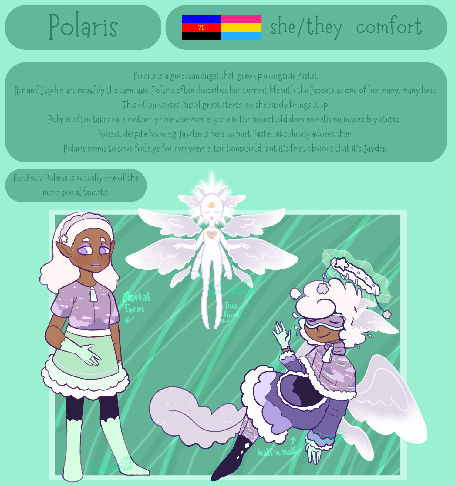 Her and Jayden are roughly the same age. Polaris often describes her current life with the Faucets as one of her many, many lives. This often causes Pastel great stress, so she rarely brings it up. Polaris often takes on a motherly role whenever anyone in the household does something incredibly stupid. Despite knowing Jayden is here to hurt Pastel, she absolutely adores them. Polaris seems to have feelings for everyone in the household, but it's first obvious that Jayden was her biggest crush.