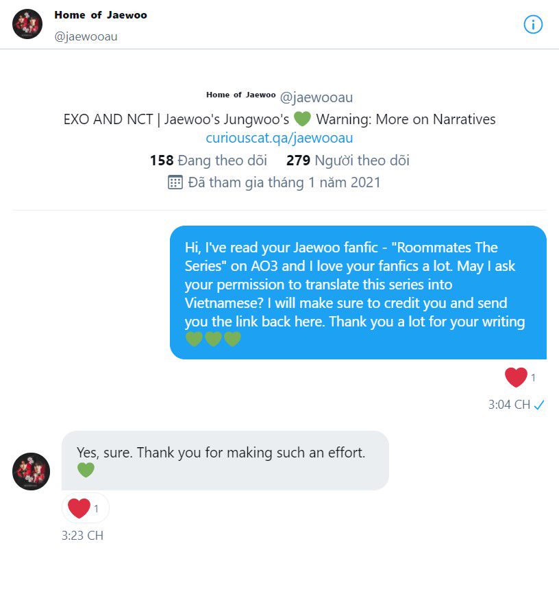Bạn tác giả cũng viết rất nhiều Jaewoo AU trên Twitter. Twitter của tác giả @jaewooau (Home of Jaewoo). Mọi người ủng hộ bạn cả trên twitter nữa nha.