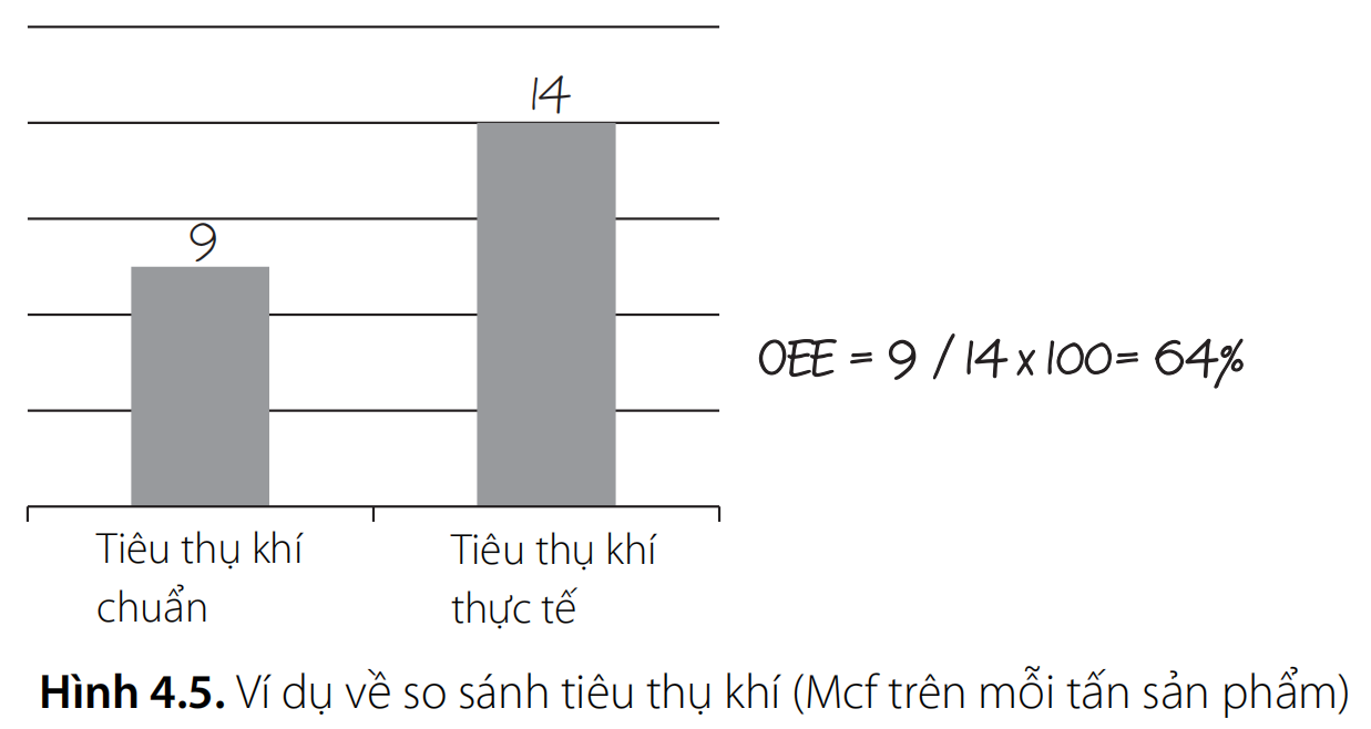 Trong các lò liên tục sử dụng khí, hiệu quả tổng thể của thiết bị có thể được đánh giá gián tiếp thông qua phân tích tiêu chuẩn so với thực tế về mức tiêu thụ khí (Hình 4.5). Tiêu chuẩn tiêu thụ nên được tính toán một cách chính xác và được xác minh so với dữ liệu tiêu thụ lịch sử, sau đó công thức có thể được áp dụng.