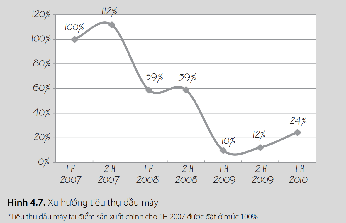 Chúng tôi đã mời một chuyên gia thủy lực nổi tiếng đến đào tạo nhân viên về các phương pháp vận hành đúng cách. Hành động đầu tiên của chúng tôi là mua các bộ phận cao su, bộ lọc dầu và không khí, và một loại dầu mới đặc hơn. Sau khi xả sạch bể chứa dầu, thay dầu, các bộ phận cao su và bộ lọc – mọi thứ đã được cải thiện (Hình 4.7).