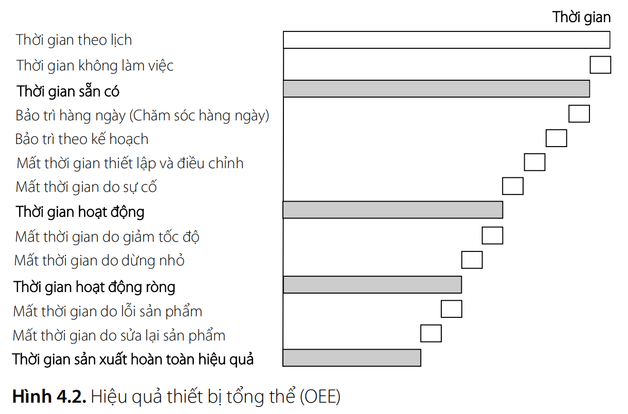 Dựa trên các loại mất mát thời gian ngừng hoạt động này, hiệu quả thiết bị tổng thể thực tế được xác định và các mục tiêu cải tiến được đặt ra (Hình 4.2). Đối với hầu hết các công ty, hiệu quả thiết bị tổng thể không quá 40%, trong khi các công ty tiên tiến nhất đạt tới 85%.