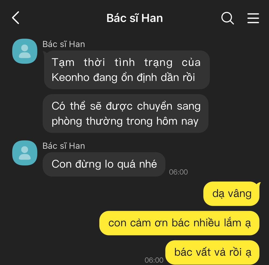 Tôi đọc đi đọc lại dòng tin nhắn, nước mắt lăn dài trên má. Suốt đêm qua, tôi không dám rời khỏi bệnh viện dù một giây. Cứ mỗi lần chợp mắt, hình ảnh Keonho thoi thóp trên giường bệnh lại hiện về ám ảnh.