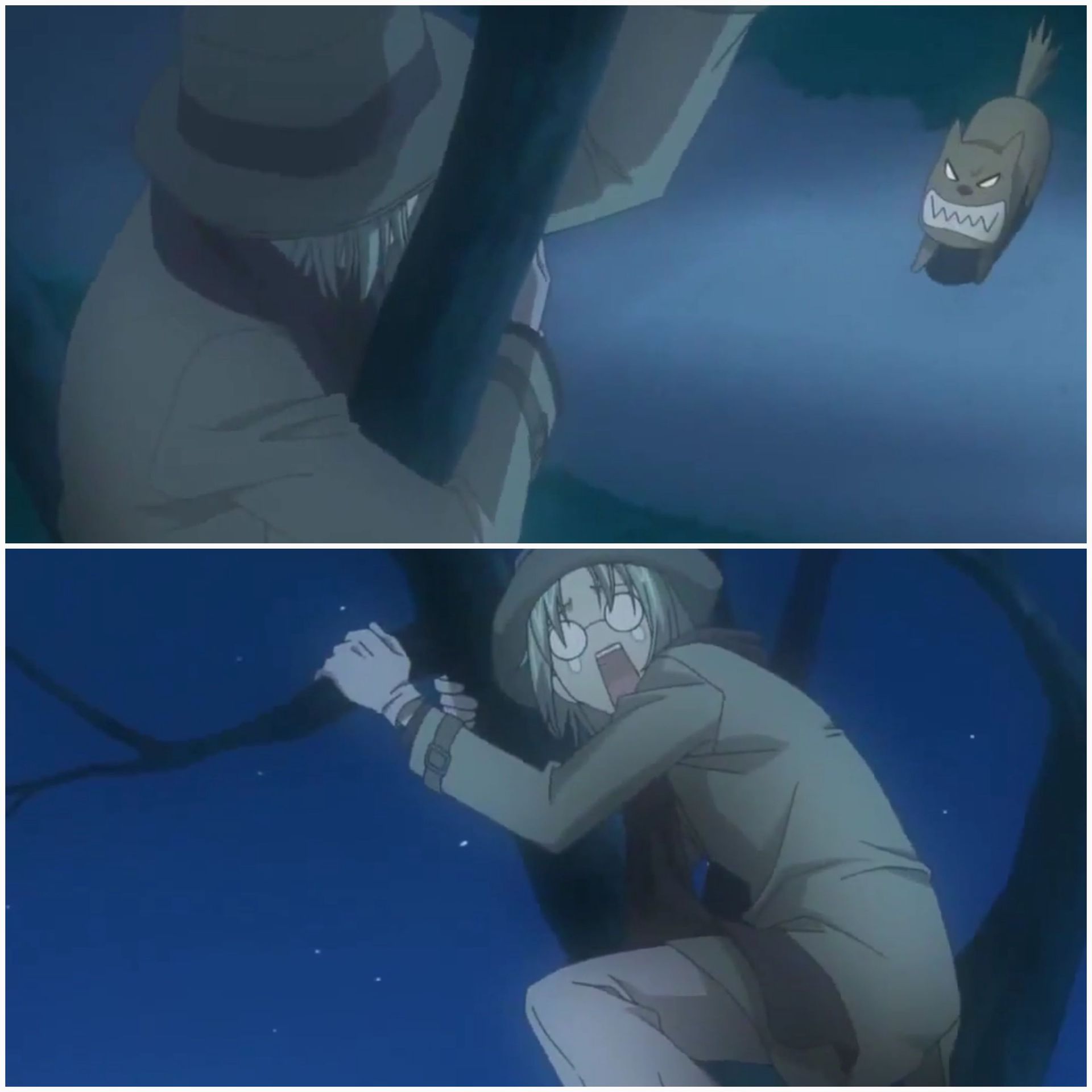 Cậu đi tới gần tiếng gần tiếng hét thì thấy một người đàn ông đeo kính đang bấu trên cây la hét.