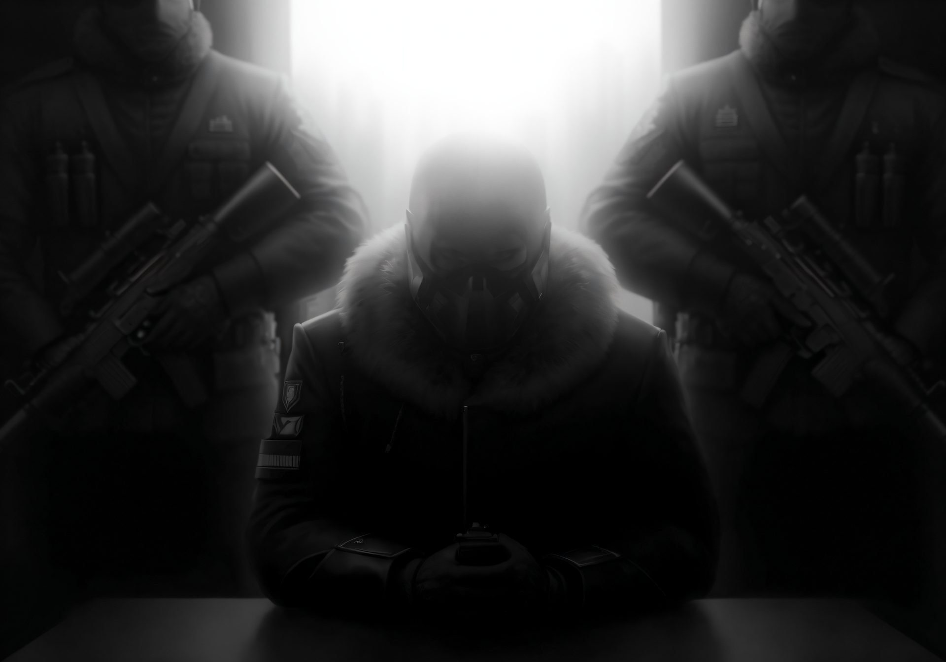 Ông ta trùm kín đầu với một chiếc mặt nạ cơ học trước miệng, mặt áo khoác da lông dày quanh cổ. Ông ta ngồi tại một chiếc bàn làm việc, với hai người khác đứng hai bên, mặc trang phục quân đội cầm AK gác canh.