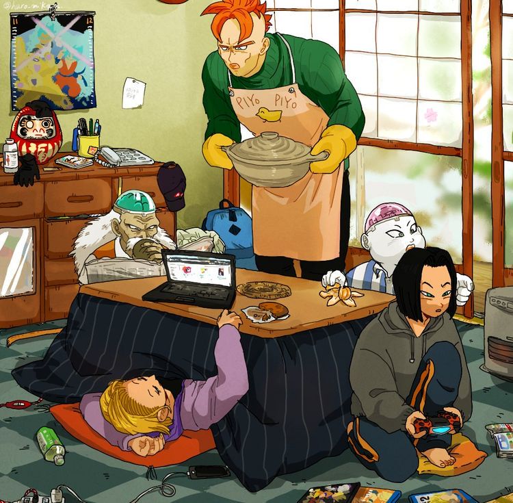 " Nó bắn mày kìa! Ở góc đá đó." Android 19 cũng đang muốn chơi. Dr.Gero đang nhâm nhi cốc trà và đọc tờ báo: " Tập đoàn Capsule lại có phát minh mới rồi...hmm chắc ta cũng phải làm gì đó". Android 16 đặt nồi súp miso lên bàn. Ai nấy đều ngưng việc cá nhân rồi bắt đầu bữa sáng.