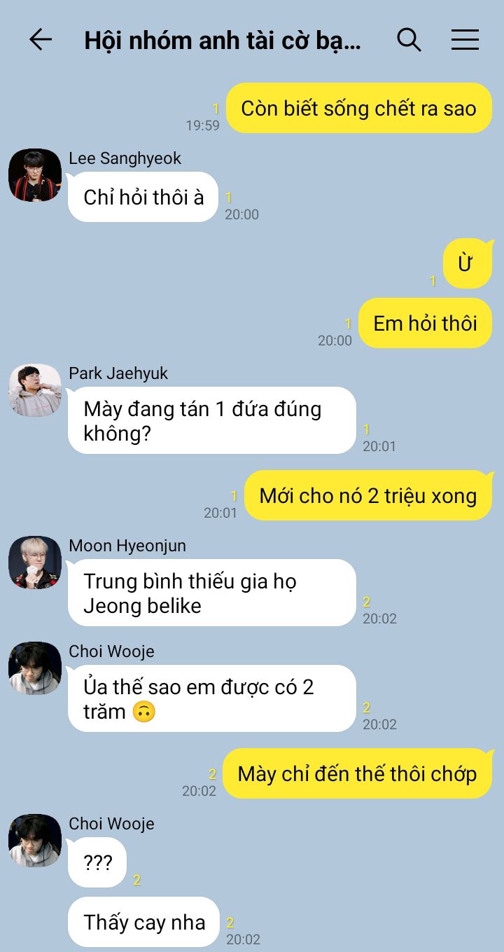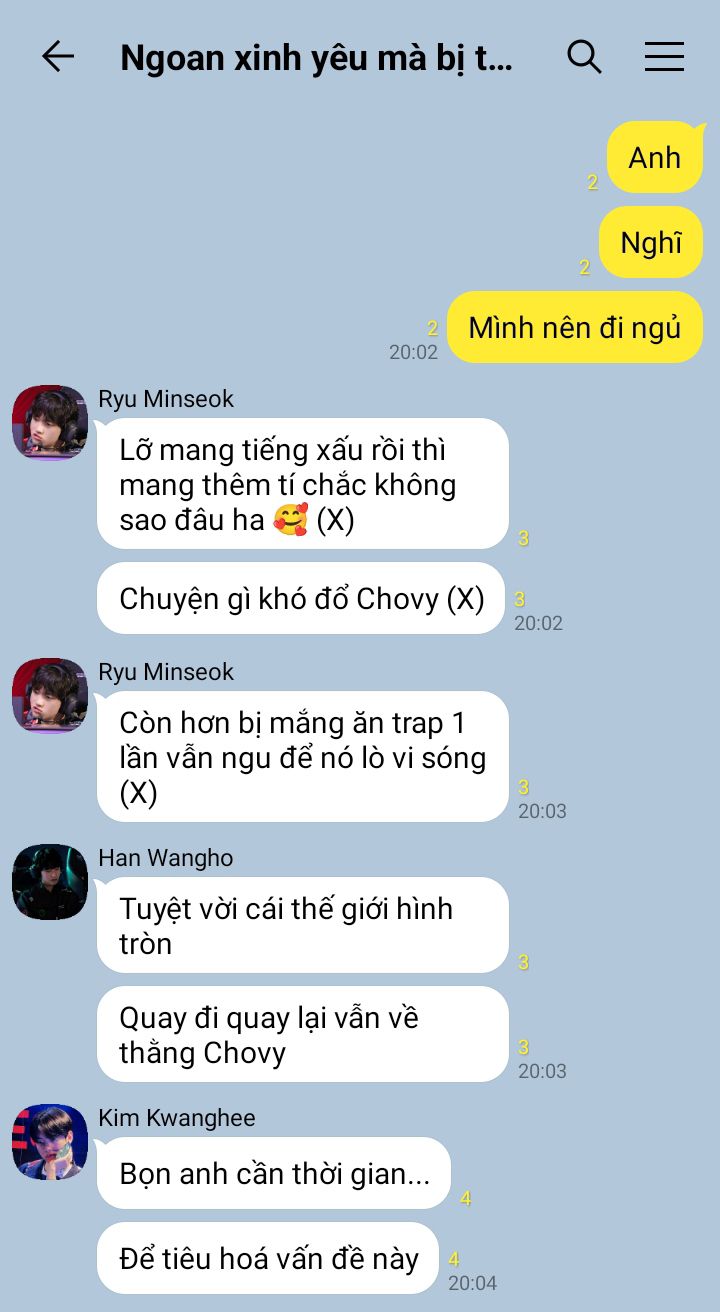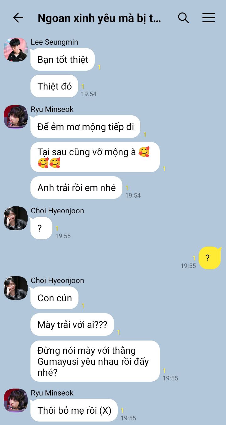 "Anh còn định block nó đấy." Han Wangho nhún vai. Anh đưa tay vuốt nhẹ mái tóc mềm của Park Dohyeon dịu dàng vỗ nhẹ mấy cái. "Lần sau khó thì bảo anh. Bọn anh chán thì hay than nghèo chứ có nghèo đâu mà sợ."